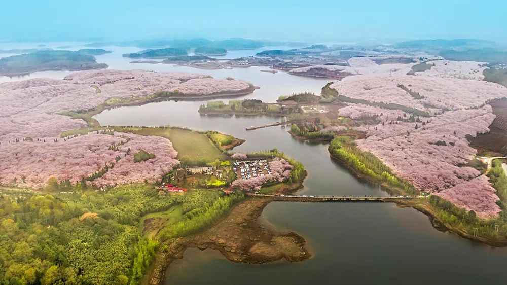 贵州,有一个叫『平坝樱花』的地方。平坝樱花,不输武汉,胜过日本,还一度上过热搜,成为新晋网红地。无论是远观,还是近玩,它都是浪漫的。从高空俯瞰,漫山遍野的绿色衬托着娇艳的粉色,盛开的冬樱犹如镶嵌在绿毯上的绣花,美丽极了。