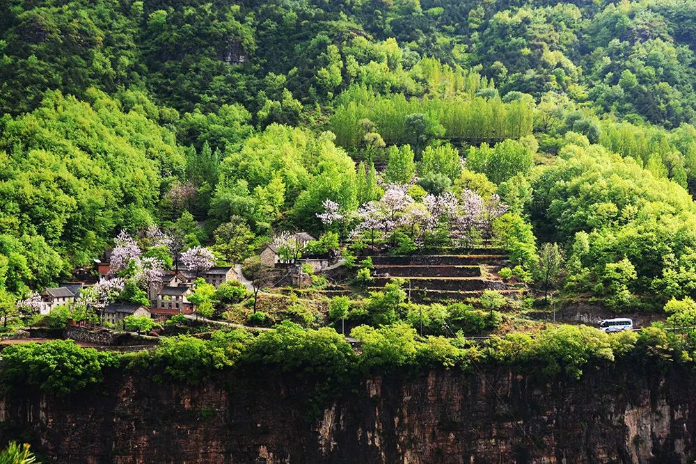 点缀山间的桃花、连翘,点点桃红,连片金黄,煞是好看。“中华影视村”郭亮,也焕发了生机。远远望去,悬崖之上,古朴的村落掩映其中,石街、石墙、石房、石瓦,仿佛一幅天然的山水画卷。