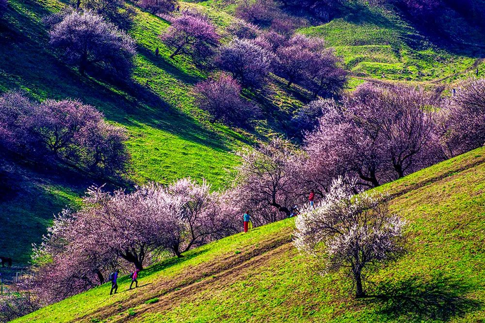 伊犁吐尔根的杏花沟有着“中国杏花之乡”的美誉。每年3月底、4月初的时候,吐尔根乡都会有将近3万多亩的杏花开满山坡。