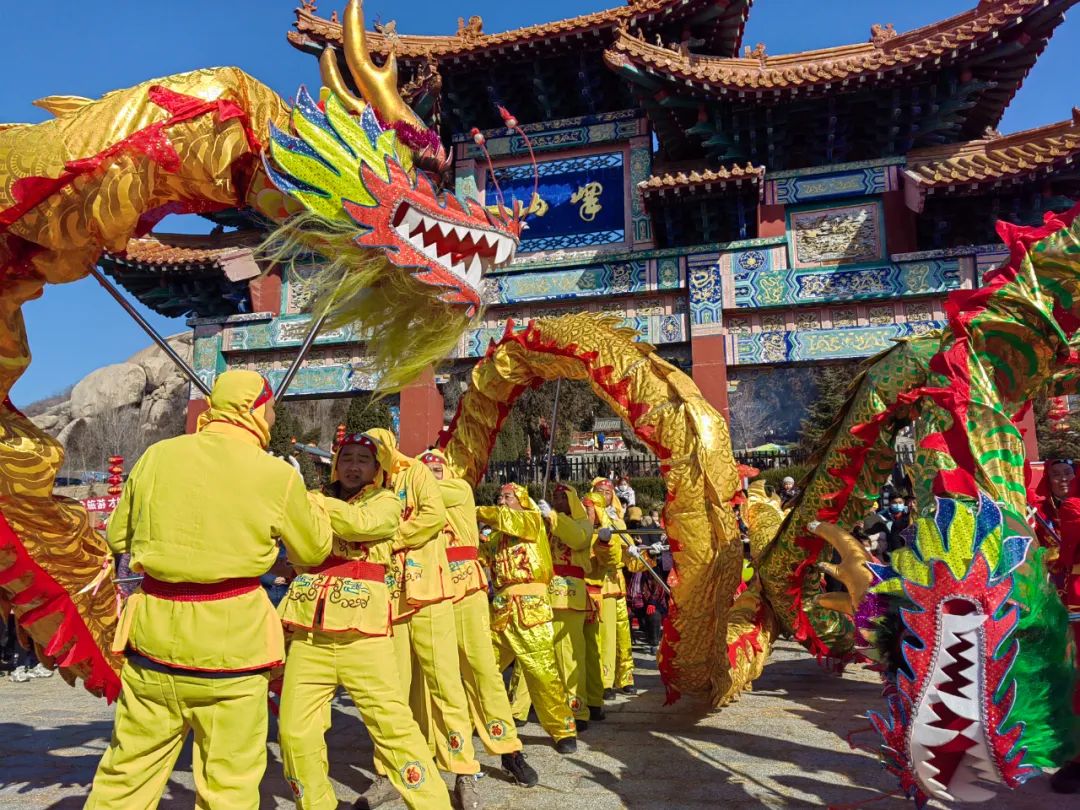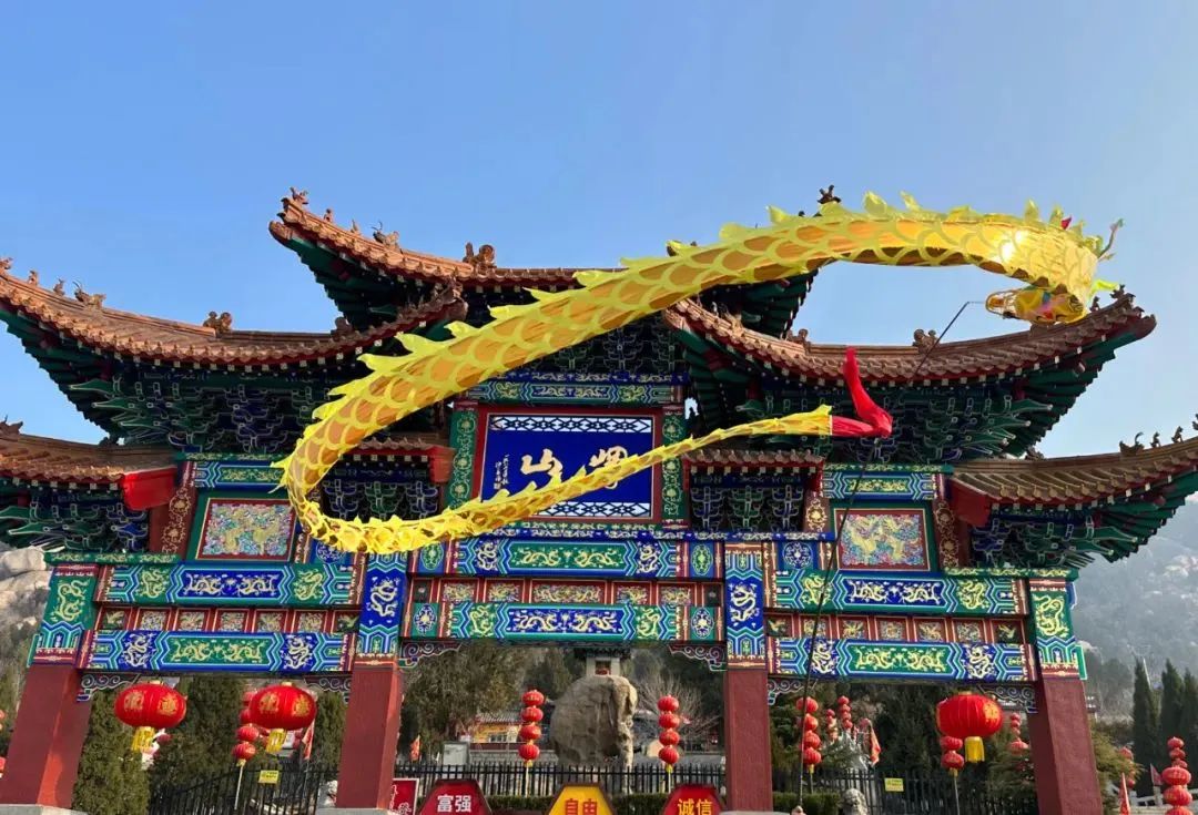 在三圣阁广场上,巍峨壮观的龙墙矗立,栩栩如生的巨龙在其上盘旋舞动,每一片龙鳞都闪耀着无数人心中的美好祈愿与深切期盼。你仿佛能感受到这份古老而深沉的力量,与峄山共同绘制着这幅民俗风情的绚丽画卷。