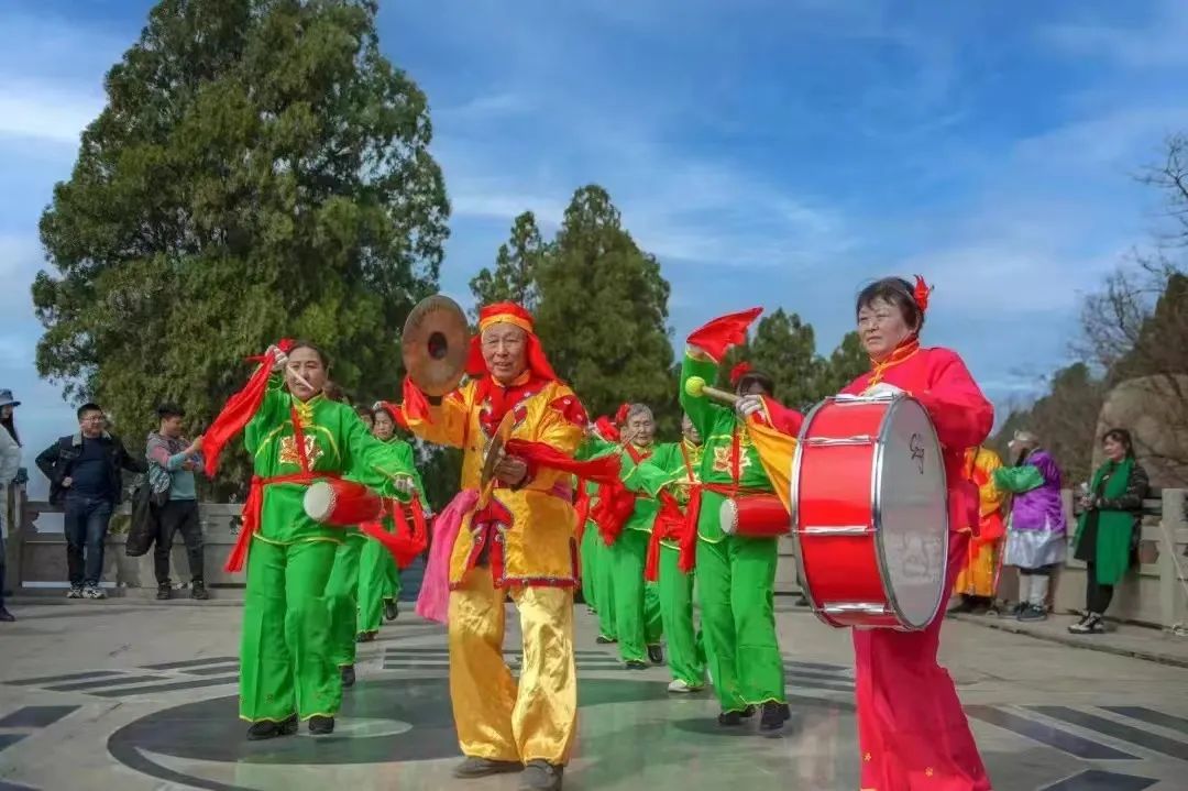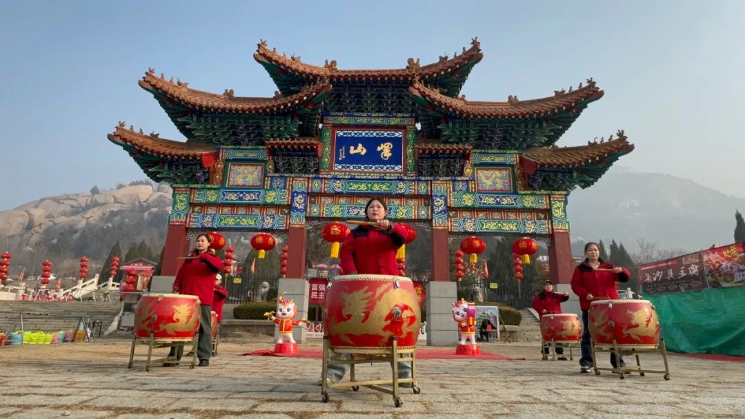 此刻,不妨闭上双眼,想象自己正置身于春意萌动的峄山怀抱中。微风拂过面颊,带来淡淡的花香和泥土的清新。漫步在古庙会的热闹街道上,你仿佛能触摸到那浓郁民俗风情的脉络。峄山牌坊下,激昂的开山鼓声奏响了天地间的和谐序曲,震撼着每一位游客的心灵。只见青春洋溢的女鼓手们身着华丽服饰,手持鼓槌,奋力敲击着大鼓。鼓声震天,充满力量与热情,仿佛能穿透云霄,回荡在整片大地之上。与此同时,舞龙队伍在空中翻腾跃动,犹如一条巨龙在云间穿梭,与激昂的鼓声相互呼应。她们以鼓为媒,重现着古老的神话传说,将祝福洒向这片万物复苏的大地,为整个庙会增添了浓厚的喜庆氛围。