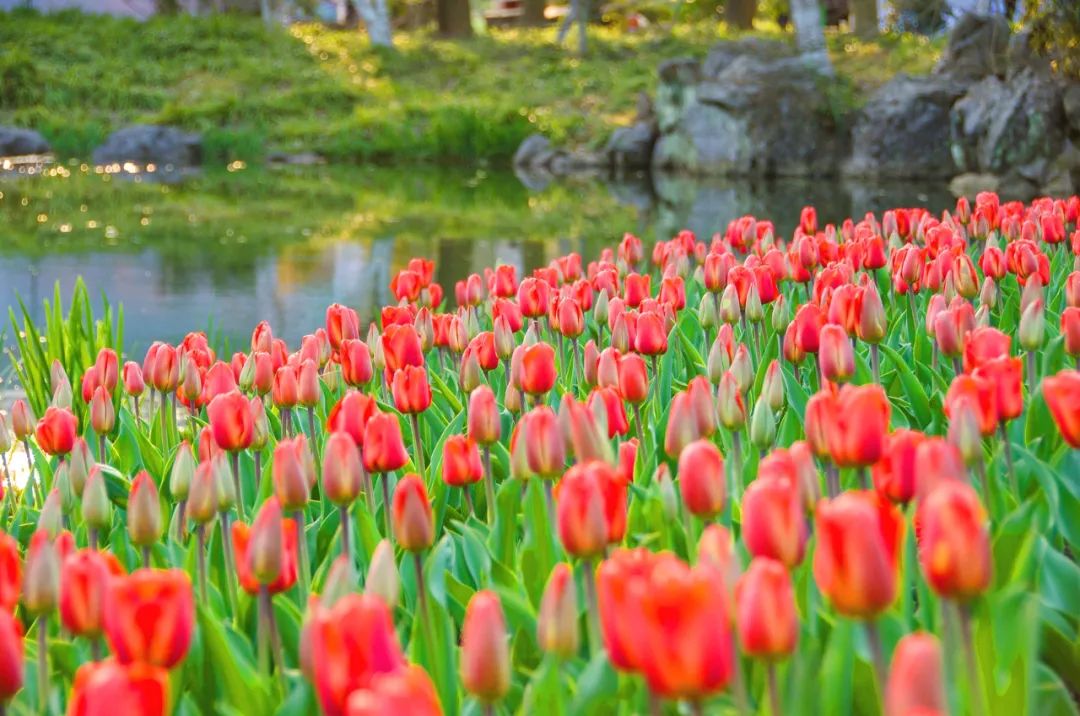 樱花和郁金香,相互映衬,真的美成一幅画。