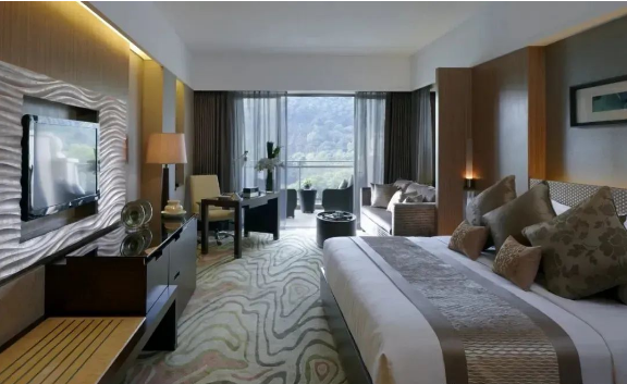 酒店三百多间房,每间都由top级设计师操刀,秉承东南亚设计的典雅风格,轻奢、大气,配置齐备。在大屏障国家森林公园的环绕下,安逸而私密,景观辽阔,放眼望去都是湖光山色,或者躺在藤椅上看云卷云舒,没有比这更惬意的了~