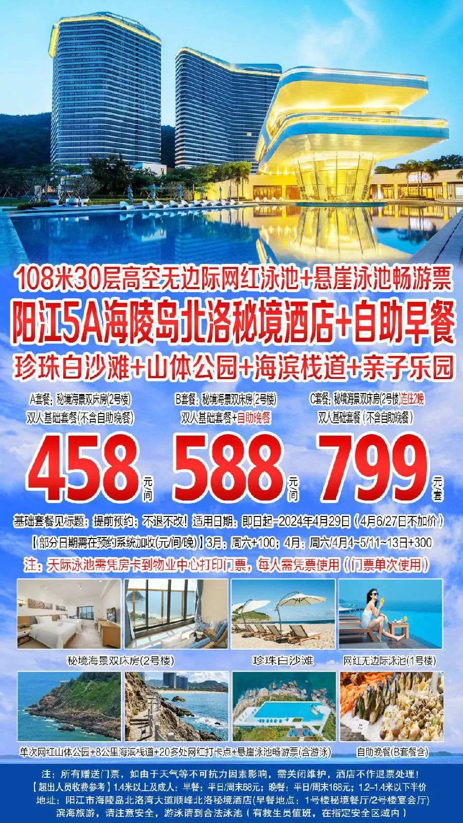 快抢!458元!阳江5A海陵岛北洛秘境度假酒店2号楼秘境海景双床房+双人自助早餐+单次(天际泳池+悬崖泳池畅游门票+山体公园)