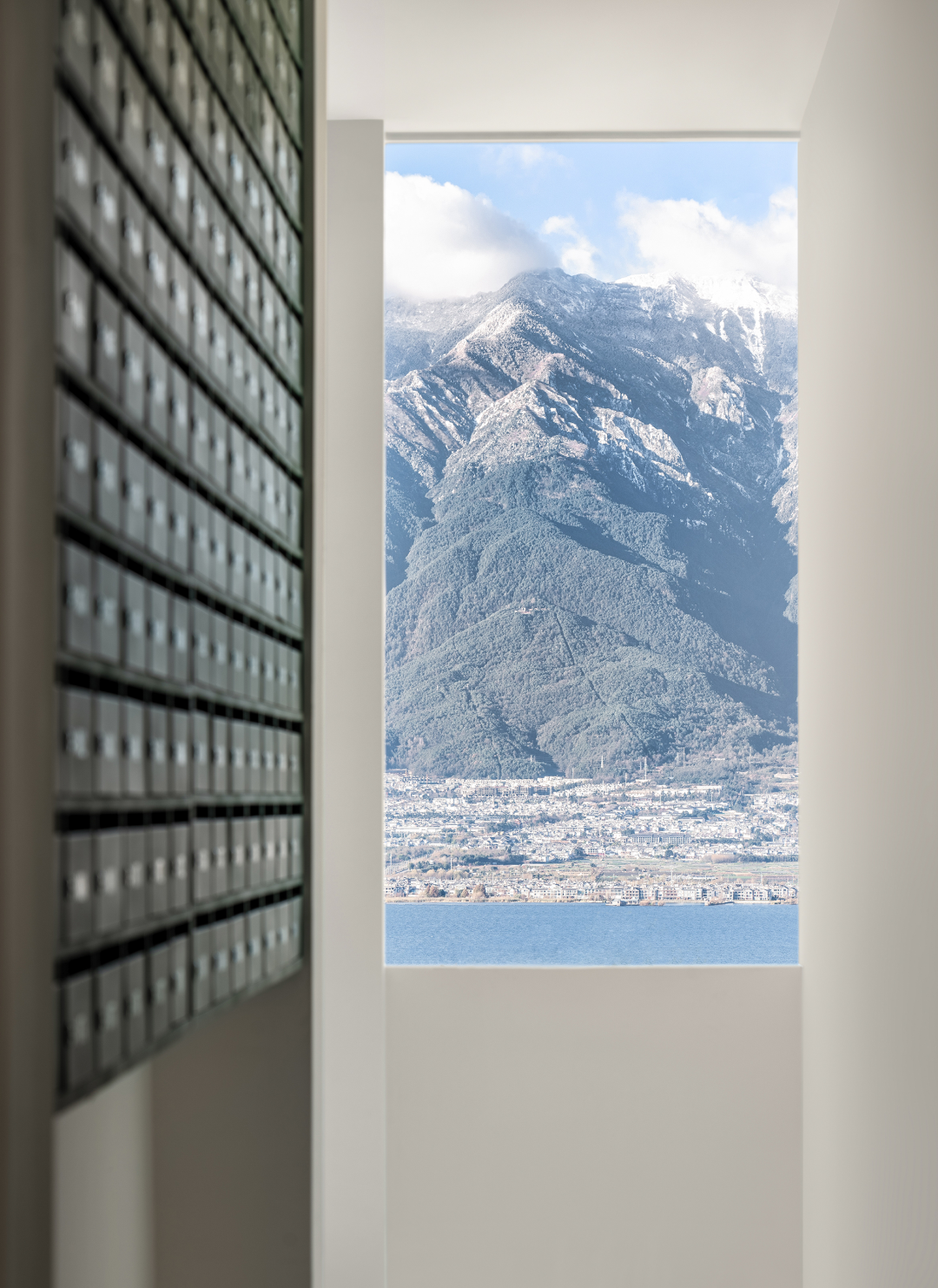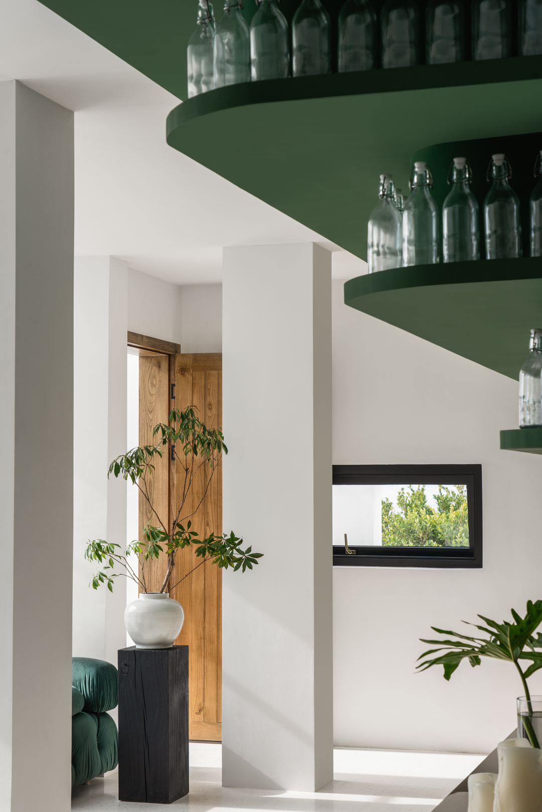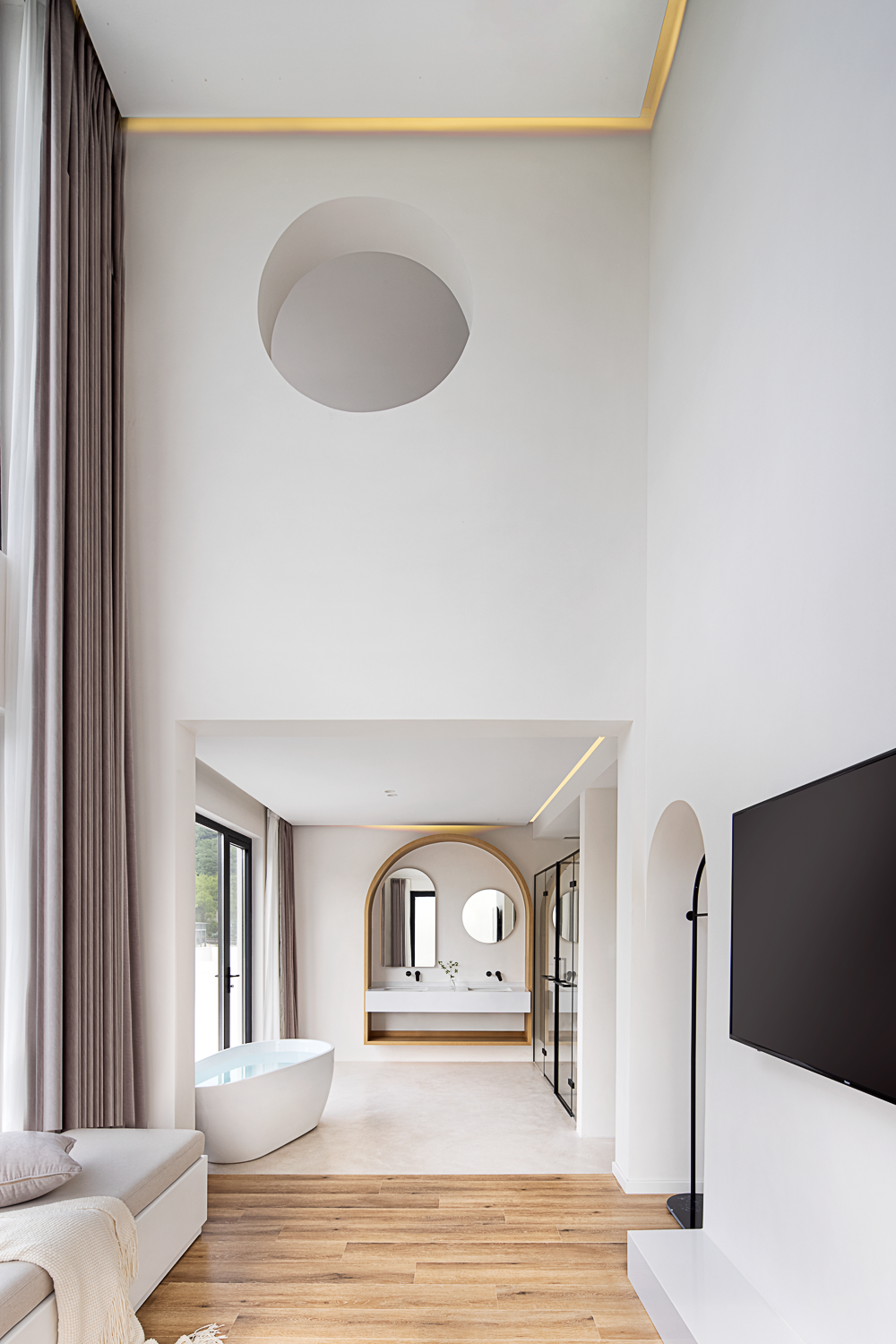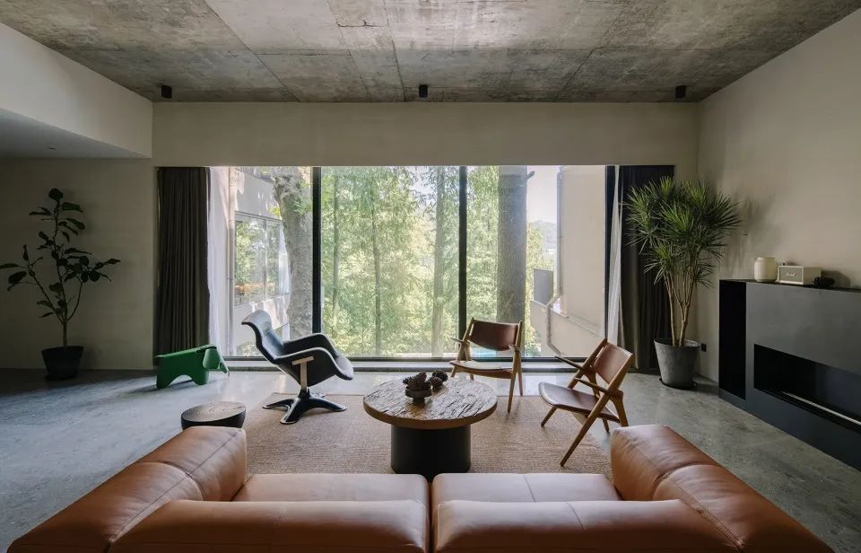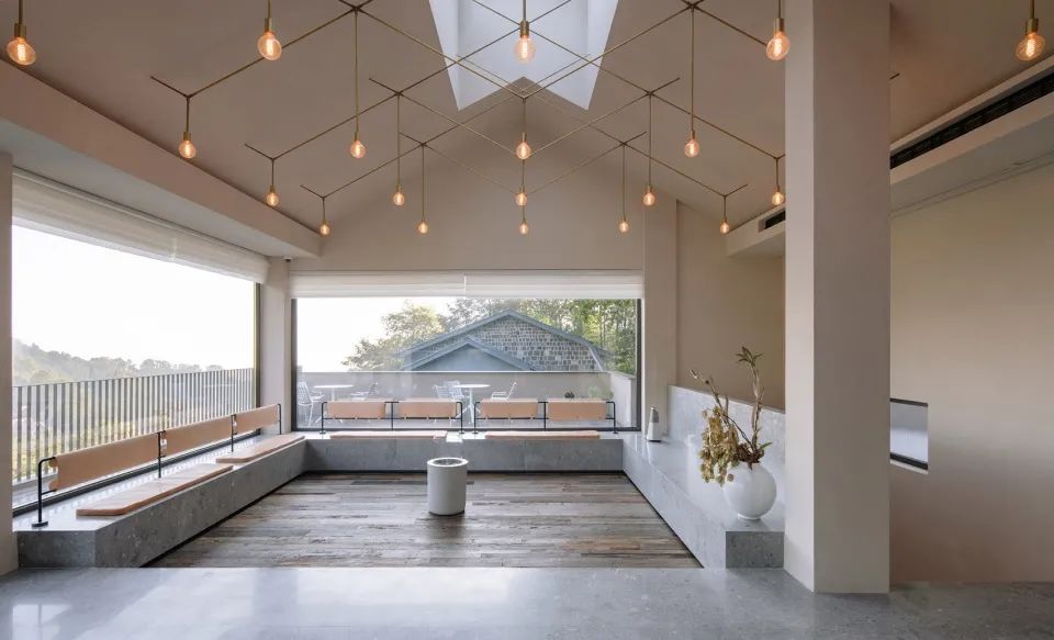 岐院,顾名思义,山水间一所小院。项目位于浙江杭州市淳安县临岐镇五庄村上谷后山小山坡上,距淳安县千岛湖镇40公里,业主是一位早年经商,现今酷爱摩旅的开朗大叔,跟一众好友游历四方后,在这片土地与山川共鸣,才决定停下脚步,与其相伴。建筑落在山上,面前先是层层跌落的农田,再一湾碧绿湖水,最后视线停留在重山密林之上。仿如馈赠的天然禀赋与人文风景,造就了一幅山水间桃源的画面。这也决定了建筑、景观与室内设计的初衷与基调。岐院由三栋单体建筑展开排成一列,与景观平行的线性布局,旨在最大化内部空间与前方山水的视线接触。关于环境与建筑二者的关系,我们并不希望这一设计被掩埋在密林之中,而是以建筑的姿态与环境对话、互诉,使建筑空间与人造环境、自然环境几者间得以达成某种微妙的动态平衡。窗,几乎是整个设计中最重要的议题:建筑、内部空间与外部环境,在这一元素上产生交汇,很大程度上决定了建筑的形神与功能分布:我们希望迈入每个房间,都有扑面而来的自然风景。
