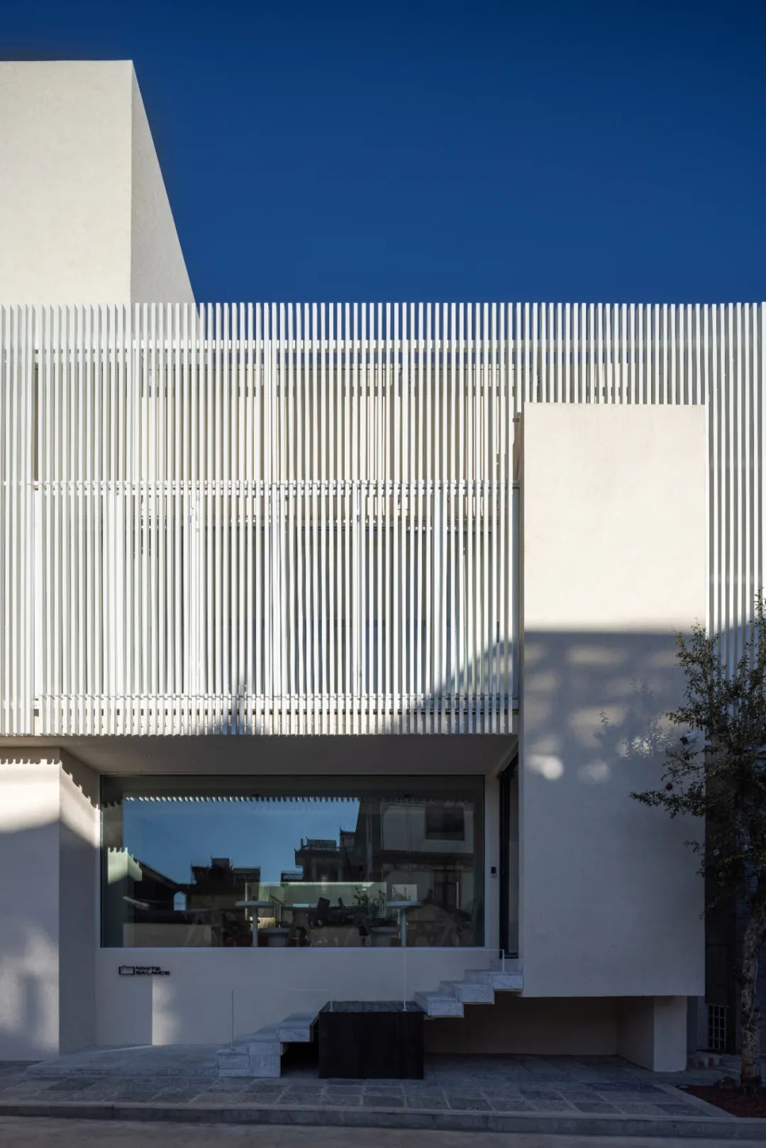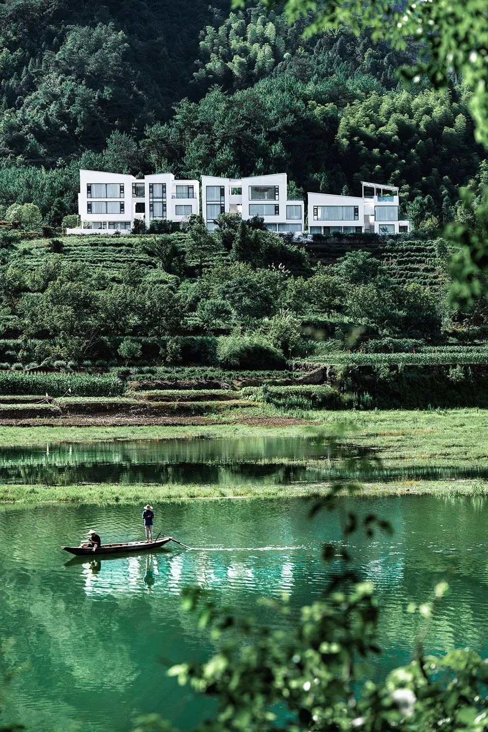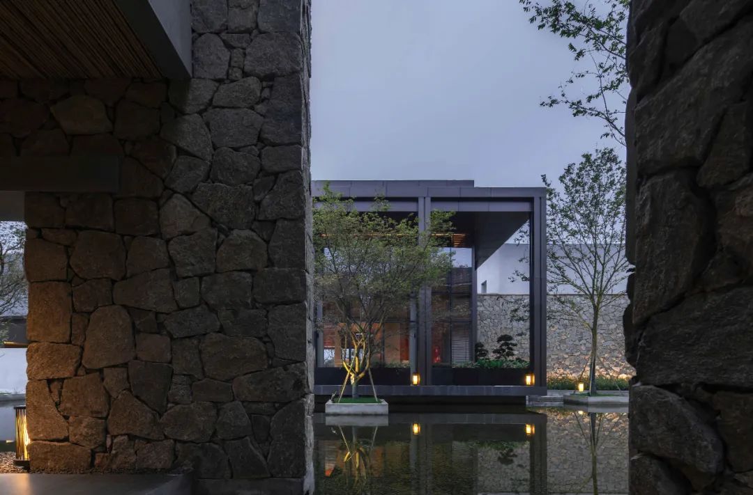 项目用地形状多边怪异,为了充分利用有限的宝贵用地,建筑师采用了一组聚落的形态去适应波折的用地边界。看似随机实则有序地建立起多个客房单元、接待空间、餐厅和茶室,将这些功能单元,又梳理成相似而可控的形态,去形成聚落的边,消失掉了人工规划的痕迹。