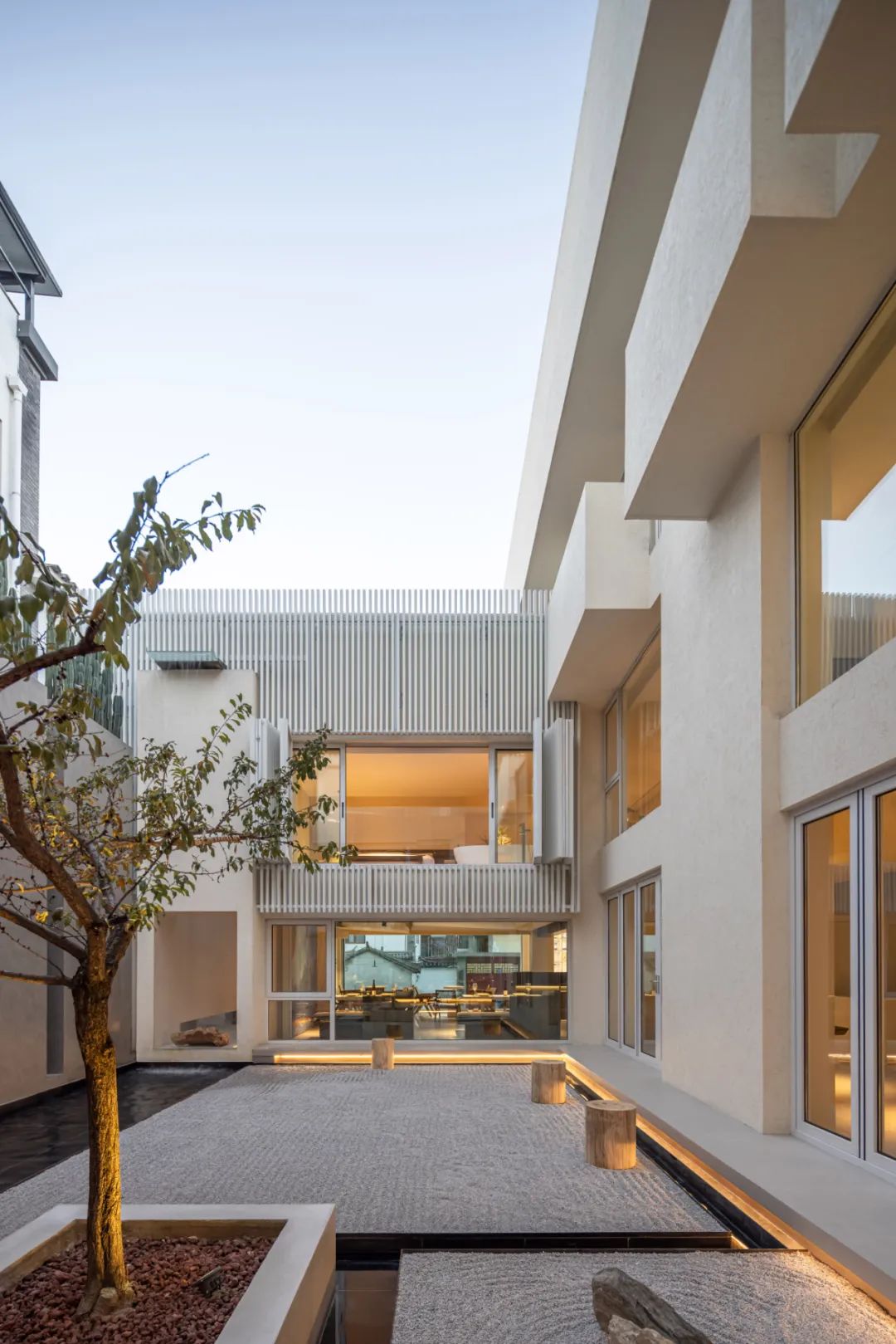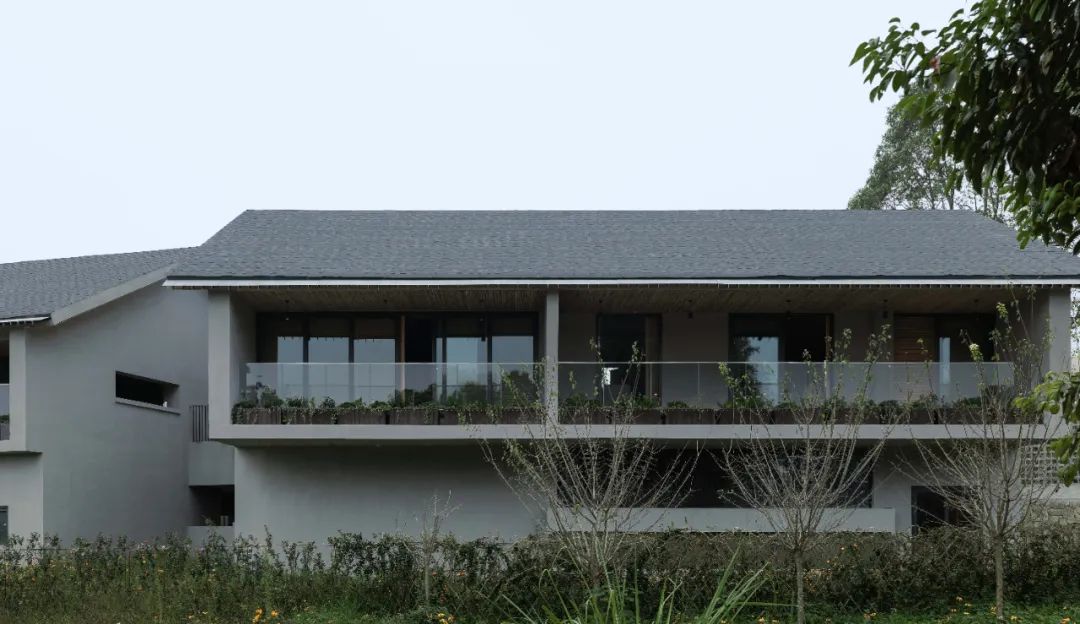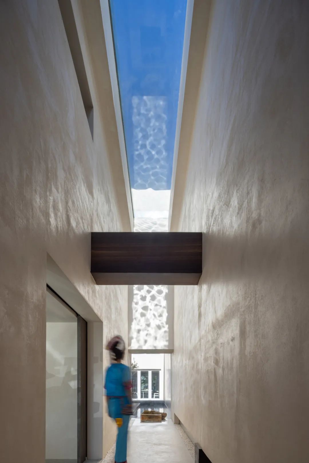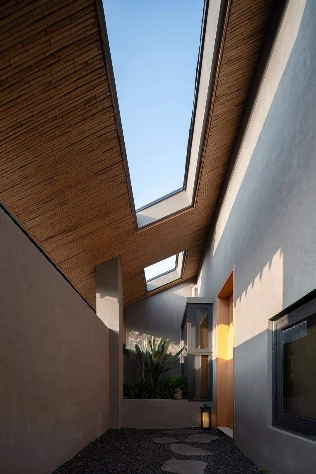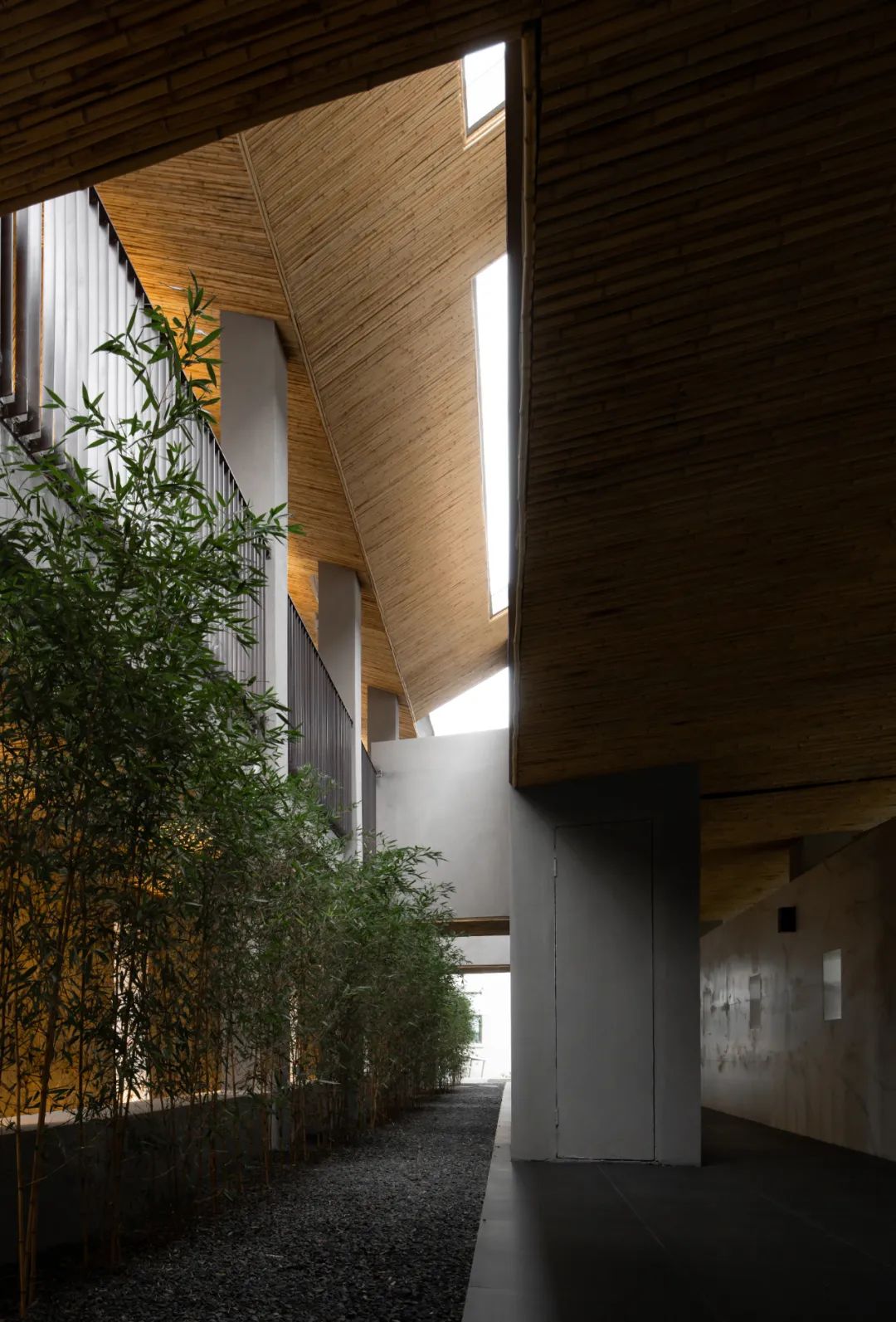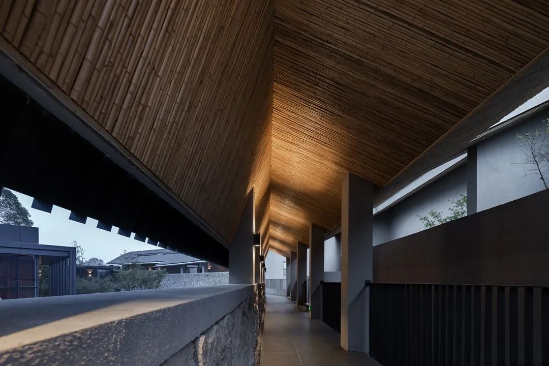 所有的客房单元和公区单元,按照向心型风车状布置,阳台则朝向四周的田野和河流,这使得每栋客房都主动寻求到了最佳的景观视野。一个 500 多平方米的水院填满了客房和公区之间的整个院落,水院四周的廊道系统又串联起了松散的客房单元和公区体量。竹院组团和水院组团以一墙之隔,相溶在一起,构成清晰完整的空间关系。二层的客房通过“小院子”与公共廊道相连,保证了客房的私密性。院子和廊子都在坡屋面的覆盖之下,屋面上不同尺度的开洞,对应了每间客房的院子或花池。在酒店内行走,不同高度的洞口会把人的视线导向水院或天空。