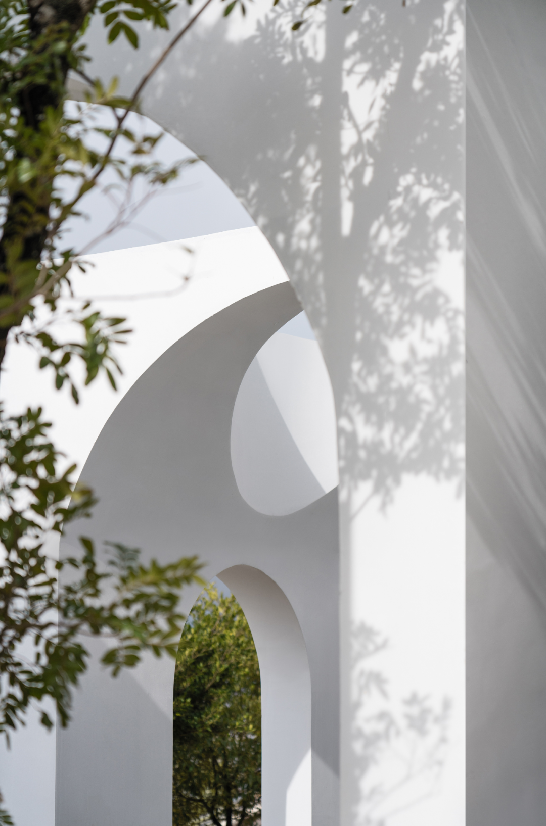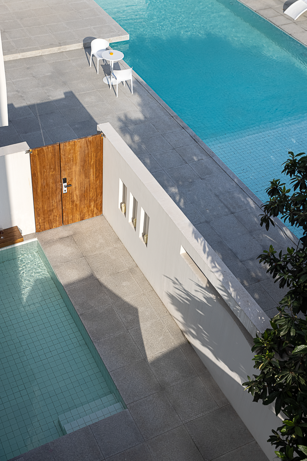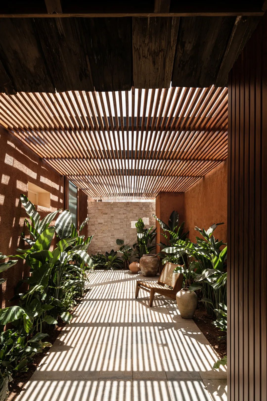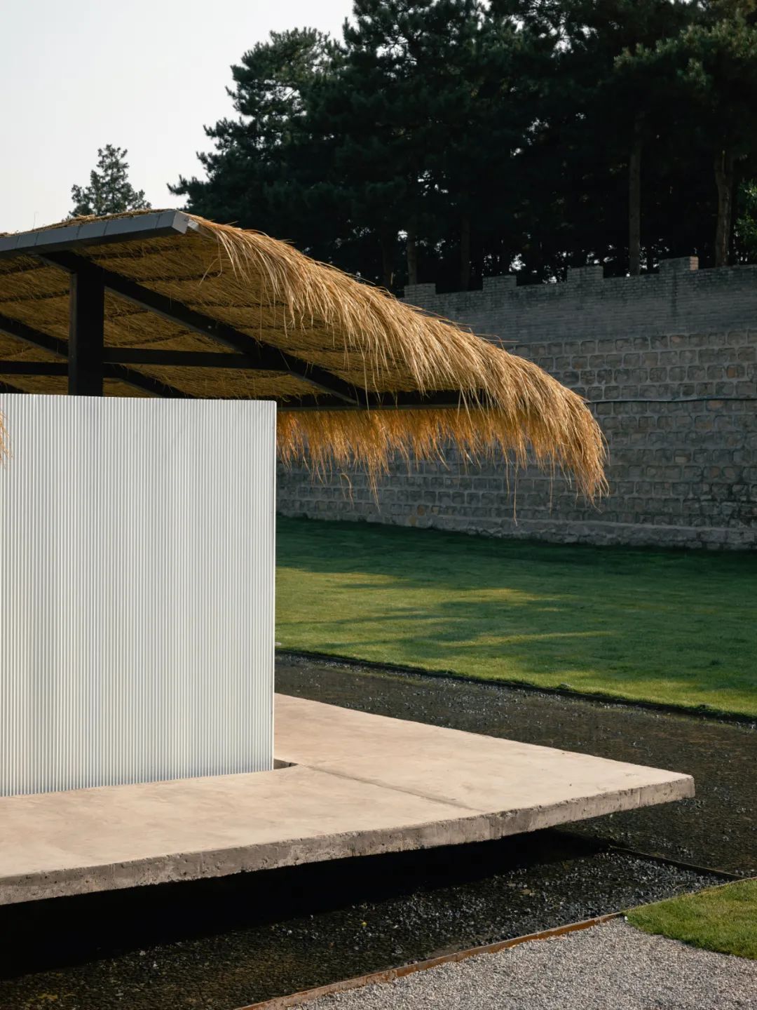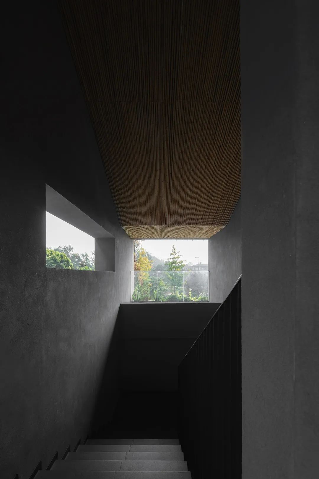 所有的客房单元和公区单元,按照向心型风车状布置,阳台则朝向四周的田野和河流,这使得每栋客房都主动寻求到了最佳的景观视野。一个 500 多平方米的水院填满了客房和公区之间的整个院落,水院四周的廊道系统又串联起了松散的客房单元和公区体量。竹院组团和水院组团以一墙之隔,相溶在一起,构成清晰完整的空间关系。二层的客房通过“小院子”与公共廊道相连,保证了客房的私密性。院子和廊子都在坡屋面的覆盖之下,屋面上不同尺度的开洞,对应了每间客房的院子或花池。在酒店内行走,不同高度的洞口会把人的视线导向水院或天空。