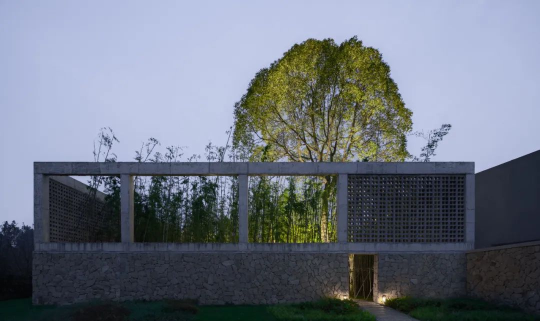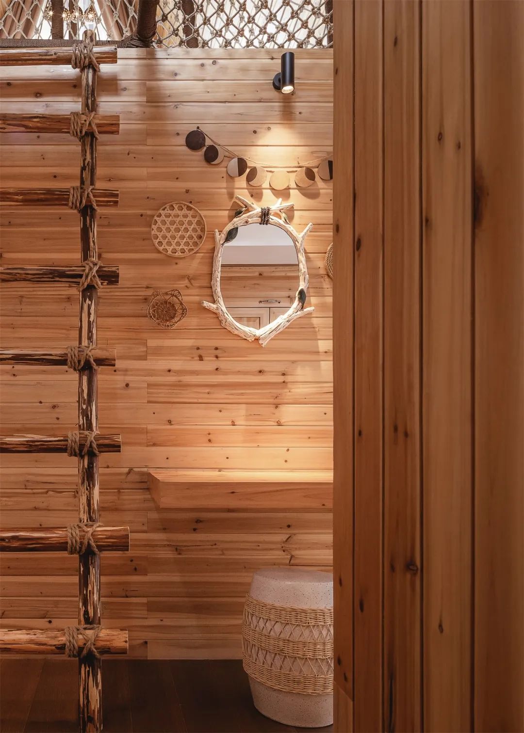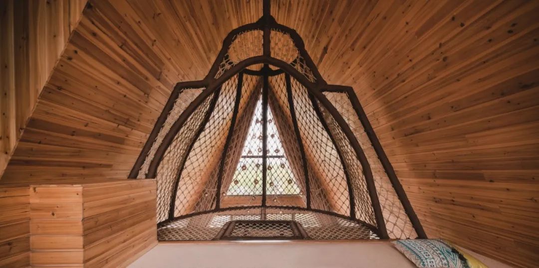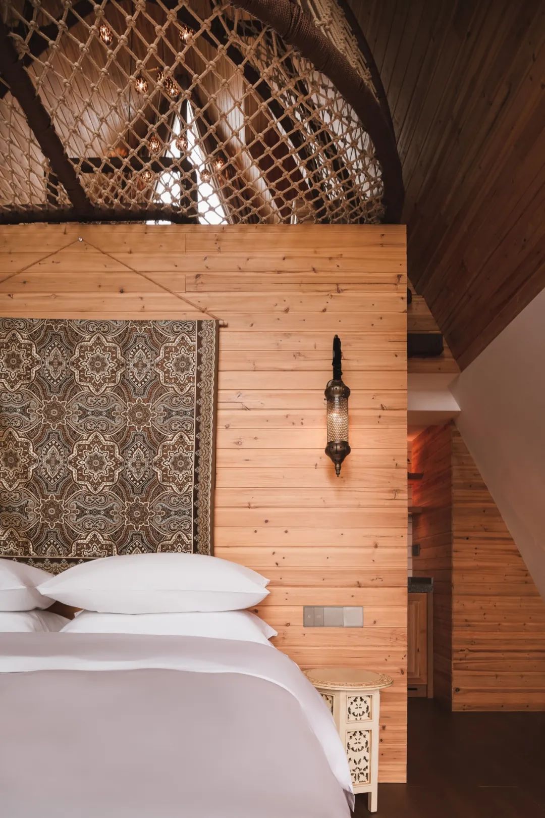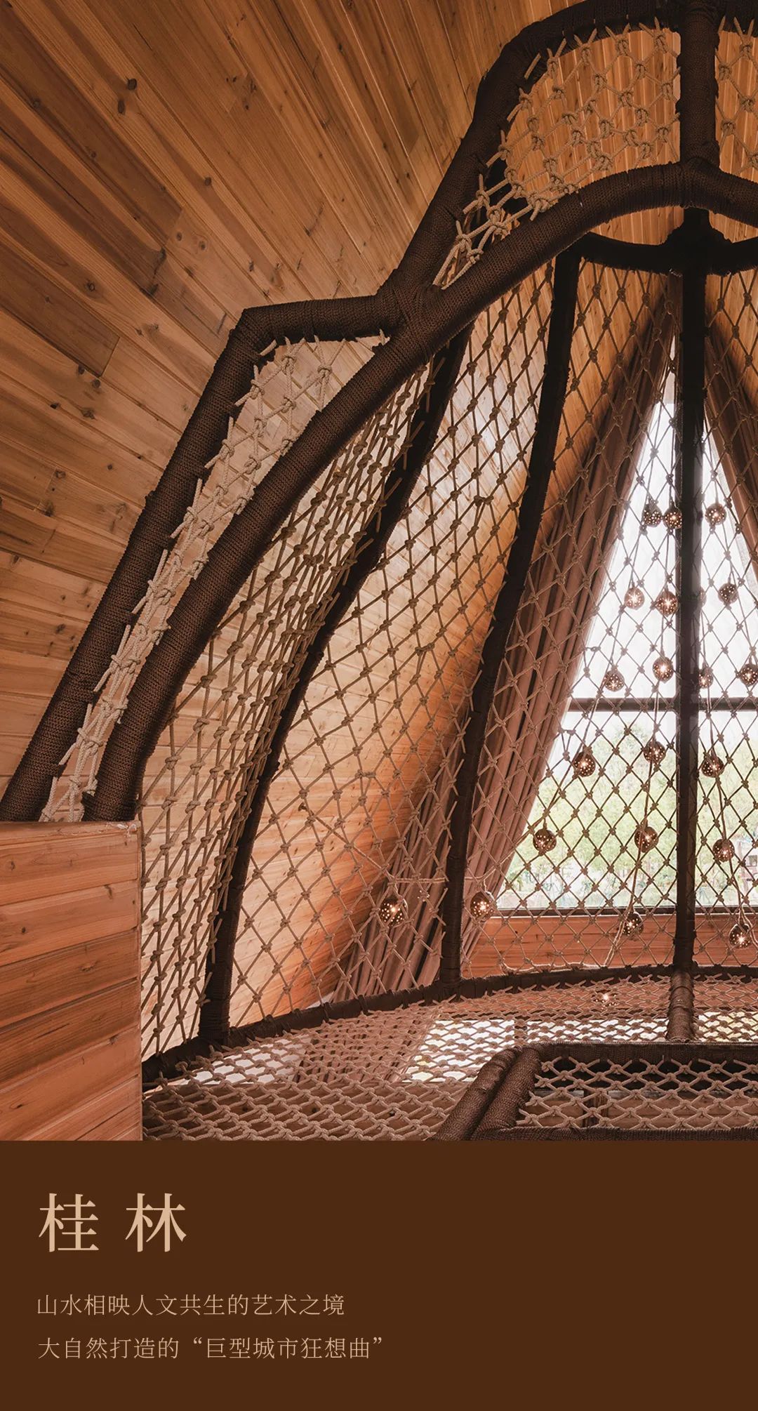 项目原为北京密云山村中一个废弃多年的小学,是在高墙包围中规则排列的四排砖木平房,业主租下物业后希望改造为高端民宿。麻绳是一种自远古以来就一直在被使用的材料,虽然极为平凡,却鲜有人将其大规模应用在建筑上。在这个项目中,我们用 6 万米麻绳,在不触碰原有建筑的情况下,改变了所有建筑的面貌。原有老建筑及其红色的瓦屋面,在麻绳的间隙中随着客人距离和视角的变换若隐若现,呈现出不同的可辨识度。场地临路的最南侧房屋被用作主入口及公共空间和服务空间,北侧三排房屋为客房。绝大多数客房都有一个探入院落的玻璃空间,承载一个诸如茶座或泡澡等独立的小功能,让客人能够以更加沉浸式的方式“深入”到院落中。在该项目中,锐度设计沿着高低起伏的群山,顺着蜿蜒静谧的漓江水,打造处处皆景的山水居所,更以桂林人文为导向,以中国人文山水式度假区,面向世界展示专属于桂林的新名片。设计运用树皮、茅草、木板瓦等仿真材料尽可能减少对环境的破坏,在极尽野趣的同时,也与环境和谐生长。将竹编材料交织装饰,辅以大面积朴素、简雅的木制品,让居住其中的人回归到原始纯粹的大自然中。卧室创造了一种新的生活体验,顶部装饰的灵感来自于鸟巢,通过麻绳编织形成空间的延伸,仿真的枯树干直接唤起了自然中的巢居意象。