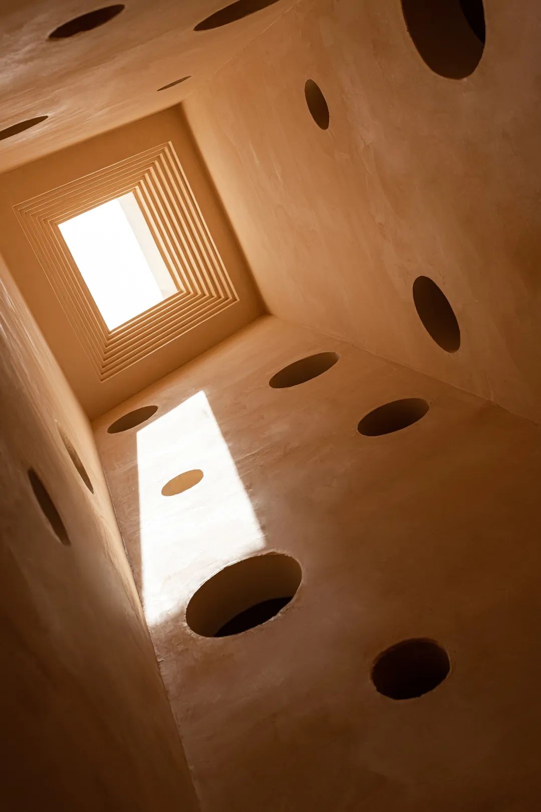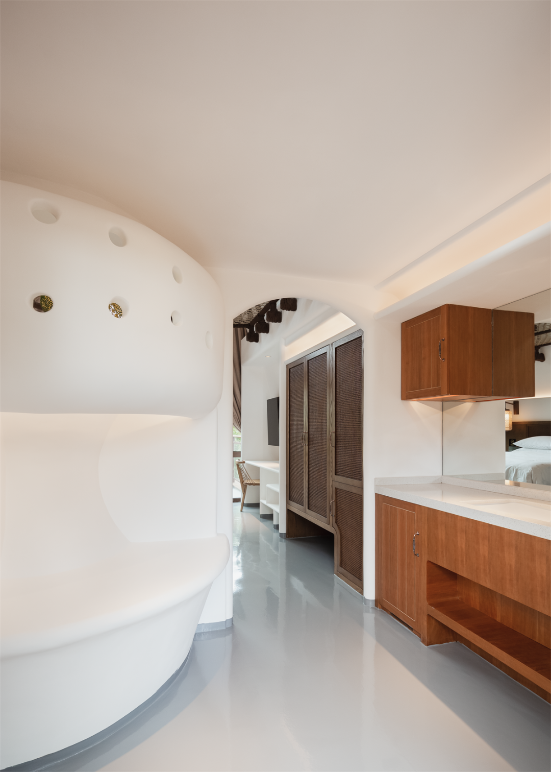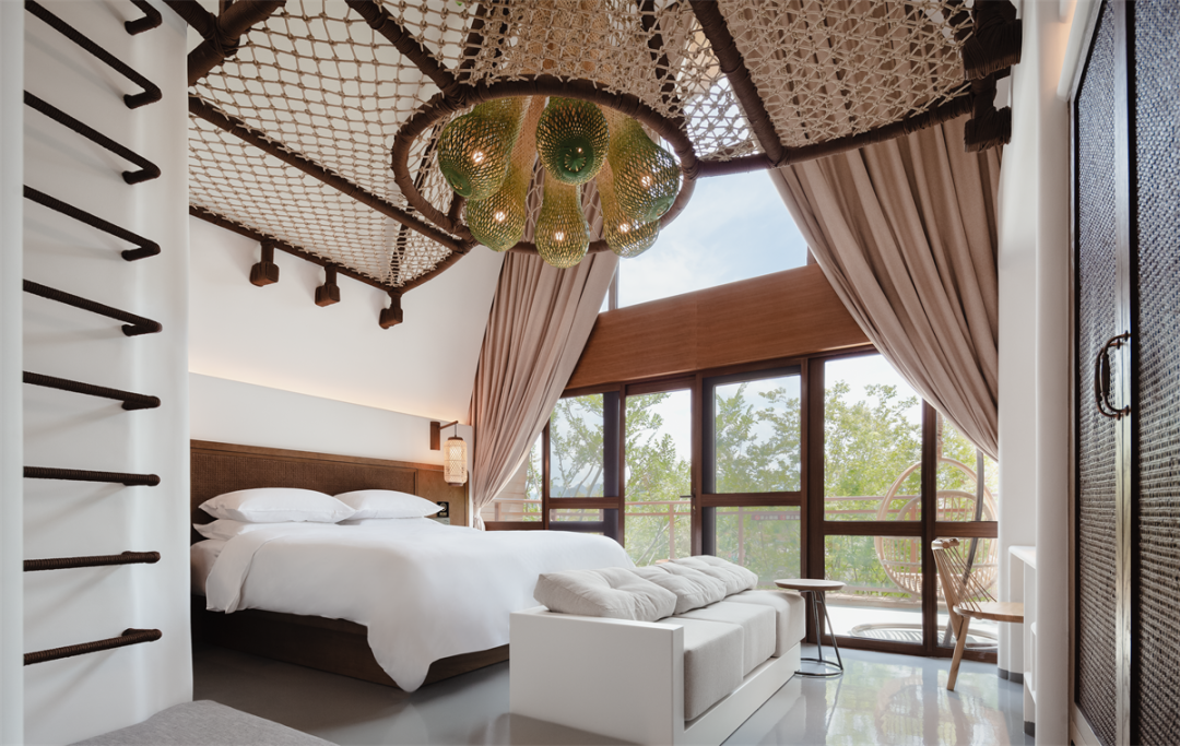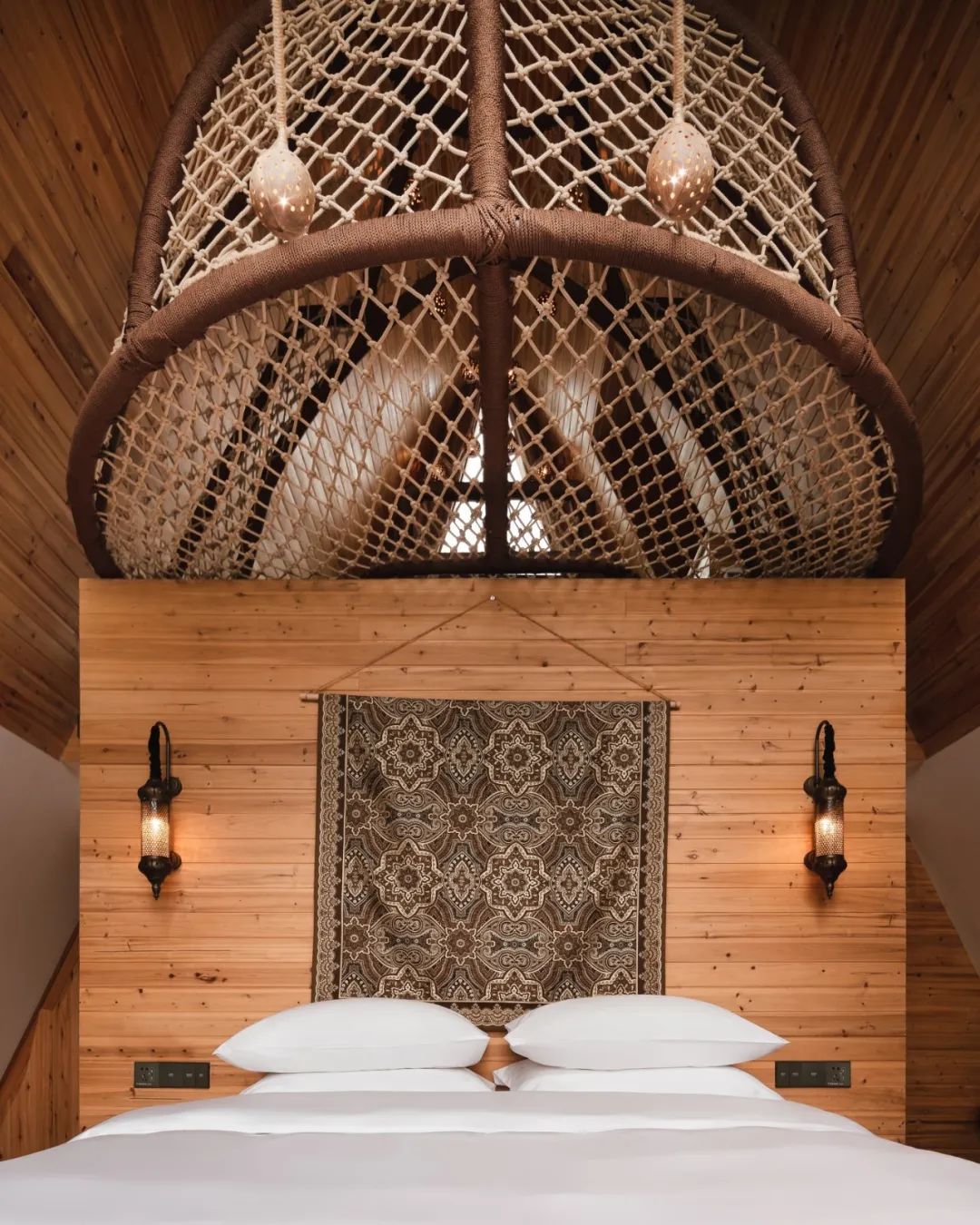 项目原为北京密云山村中一个废弃多年的小学,是在高墙包围中规则排列的四排砖木平房,业主租下物业后希望改造为高端民宿。麻绳是一种自远古以来就一直在被使用的材料,虽然极为平凡,却鲜有人将其大规模应用在建筑上。在这个项目中,我们用 6 万米麻绳,在不触碰原有建筑的情况下,改变了所有建筑的面貌。原有老建筑及其红色的瓦屋面,在麻绳的间隙中随着客人距离和视角的变换若隐若现,呈现出不同的可辨识度。场地临路的最南侧房屋被用作主入口及公共空间和服务空间,北侧三排房屋为客房。绝大多数客房都有一个探入院落的玻璃空间,承载一个诸如茶座或泡澡等独立的小功能,让客人能够以更加沉浸式的方式“深入”到院落中。在该项目中,锐度设计沿着高低起伏的群山,顺着蜿蜒静谧的漓江水,打造处处皆景的山水居所,更以桂林人文为导向,以中国人文山水式度假区,面向世界展示专属于桂林的新名片。设计运用树皮、茅草、木板瓦等仿真材料尽可能减少对环境的破坏,在极尽野趣的同时,也与环境和谐生长。将竹编材料交织装饰,辅以大面积朴素、简雅的木制品,让居住其中的人回归到原始纯粹的大自然中。卧室创造了一种新的生活体验,顶部装饰的灵感来自于鸟巢,通过麻绳编织形成空间的延伸,仿真的枯树干直接唤起了自然中的巢居意象。