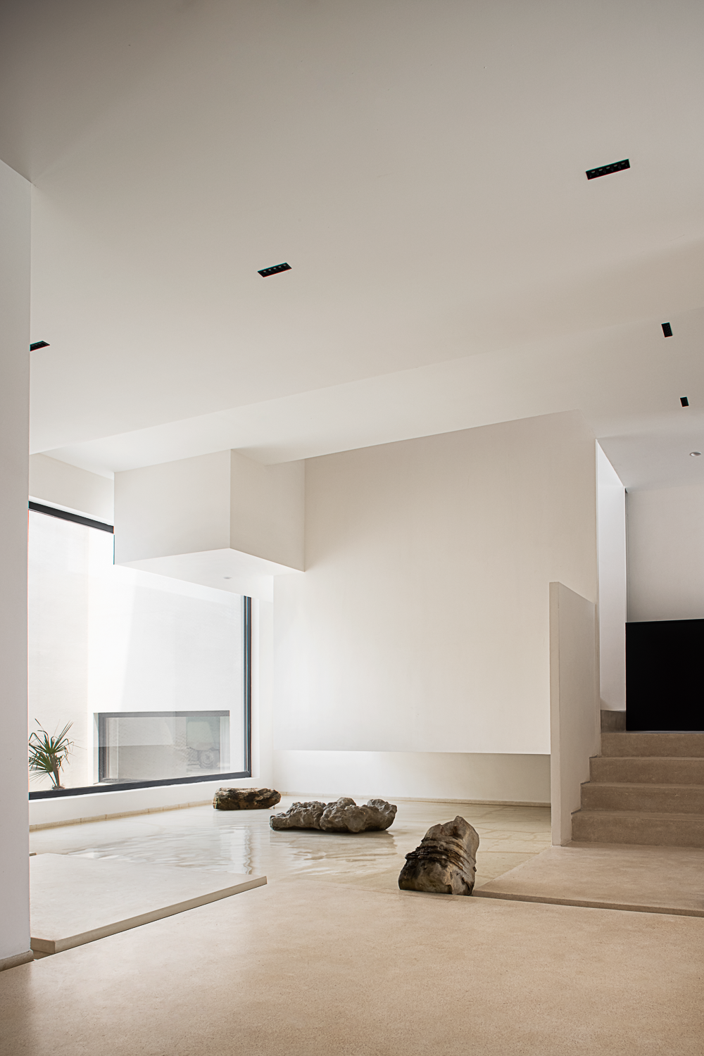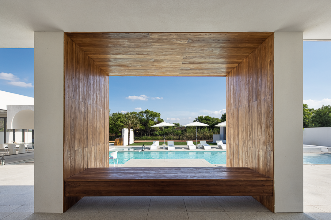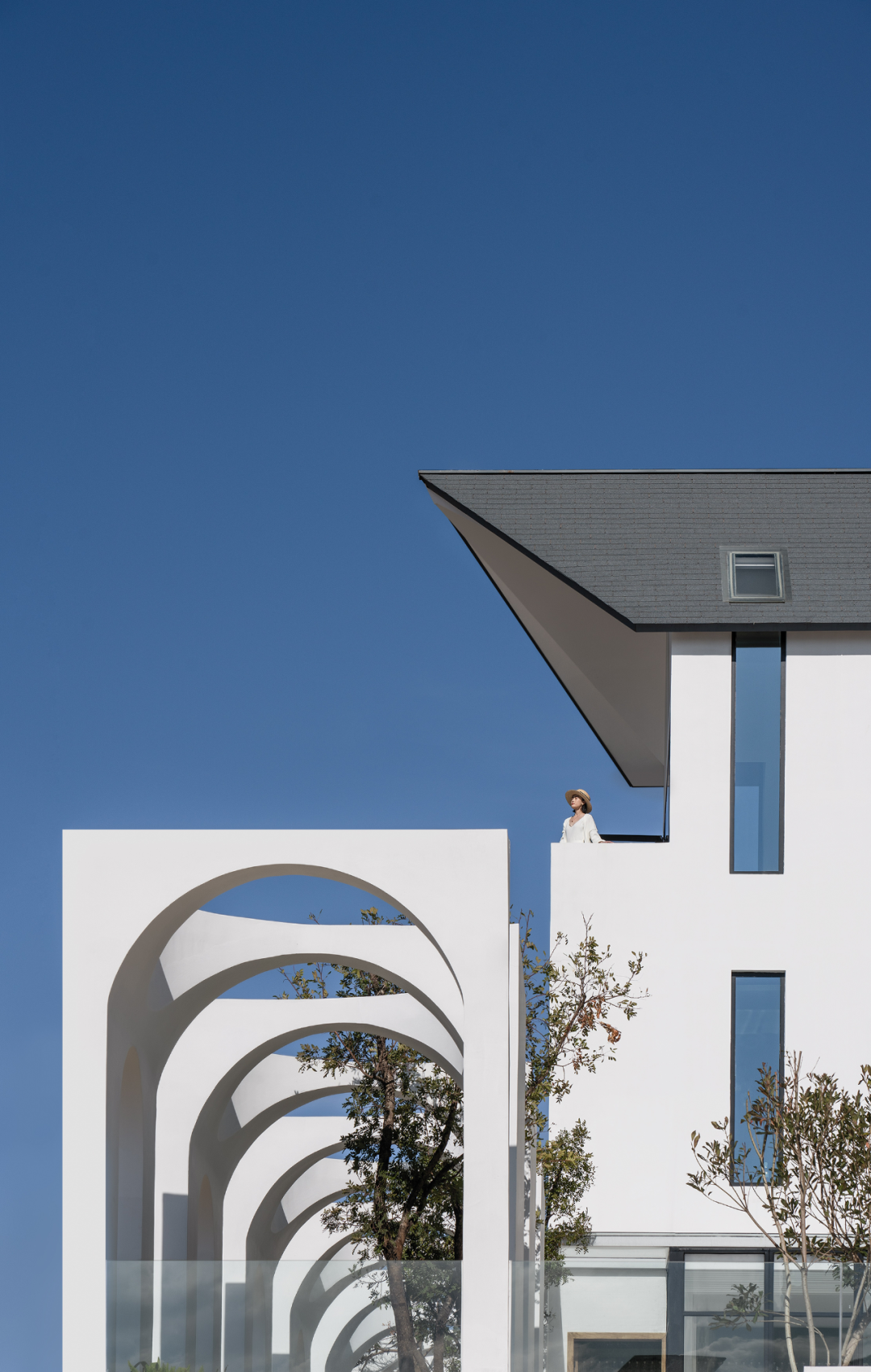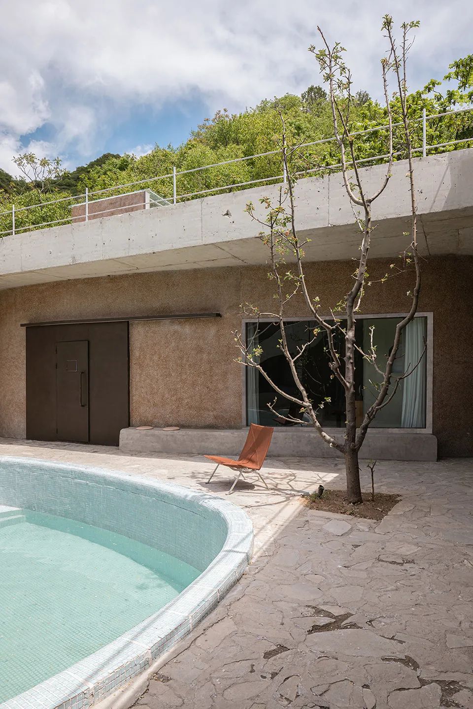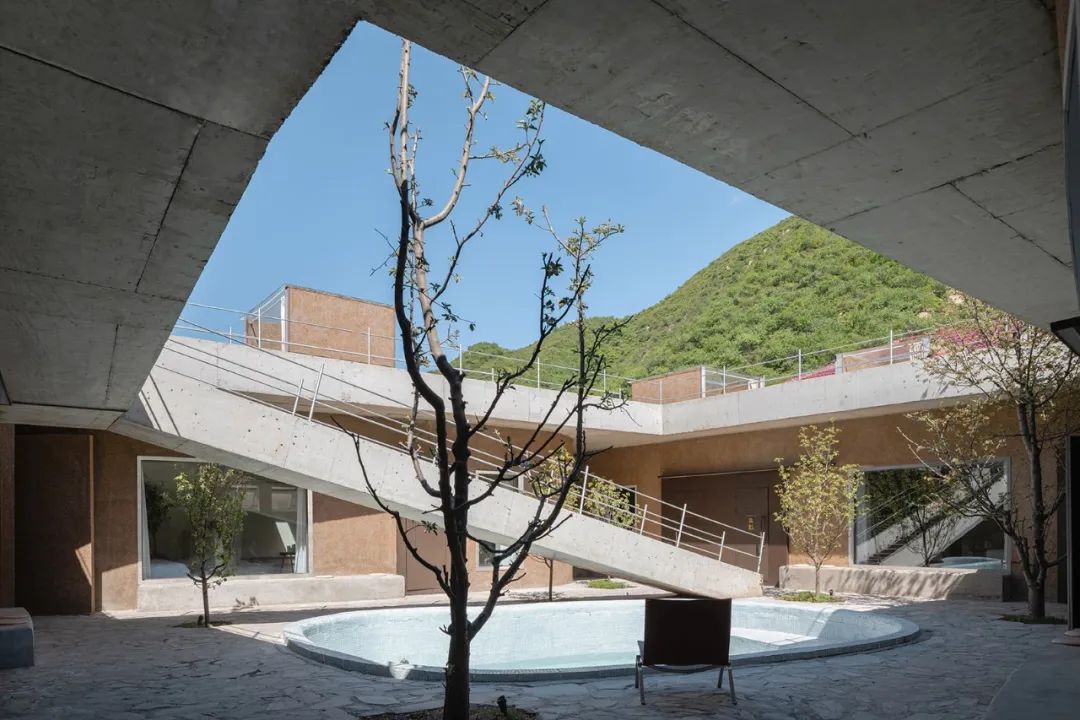 项目原址为北京周边乡村较为典型的四合院建筑,基地两面环山,山腰间长着郁郁葱葱的野树林。设计将原有四合院肌理保留,然后用一个大的板式屋顶将四个房子连接到一起,同时将每个房子的屋檐拉长,人们可以坐在屋檐下感受四季变化。院中泳池边上是连接院子与屋顶的长梯,泳池的四分之一在长梯之下,二者形成了对话关系,人们走上长梯路过泳池到达屋顶,过程中速度可快可慢。