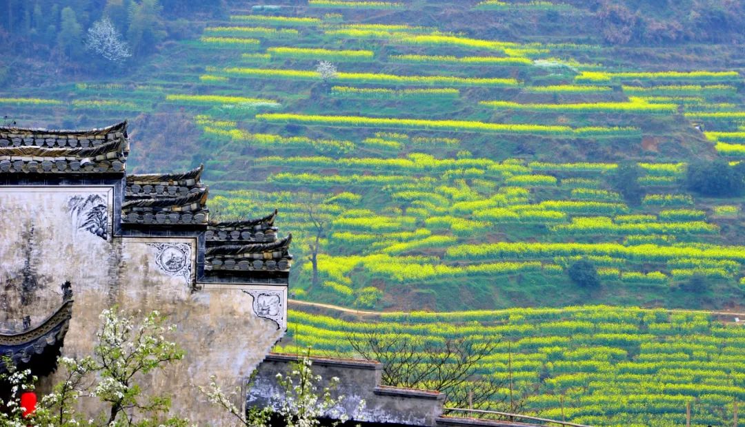 油菜花并不鲜见,某个路边田间兀自盛开或是成片争艳。只是,唯有在这,这花配了白墙黑瓦,才把这个世外桃源,充斥的宁静却又充满人烟。