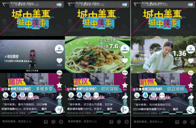 很好的例子是,#武汉热干面 抖音话题7.6亿,#勒是雾都 抖音话题相关视频播放量 23.6亿次,2023年抖音“杭州茶文化”相关视频播放量1.36亿。