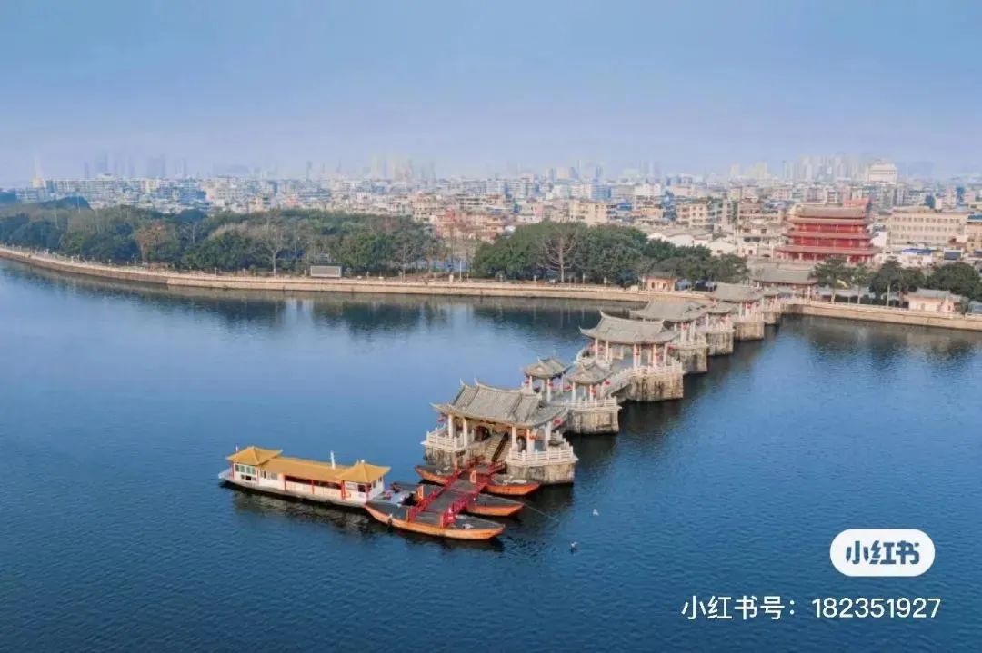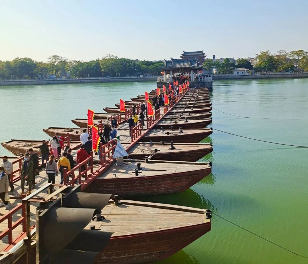 广济桥横跨韩江,联结东西两岸,集梁桥、浮桥、拱桥于一体,为古代广东通向闽浙交通要津,曾被著名桥梁专家茅以升誉为“世界上最早的启闭式桥梁”。