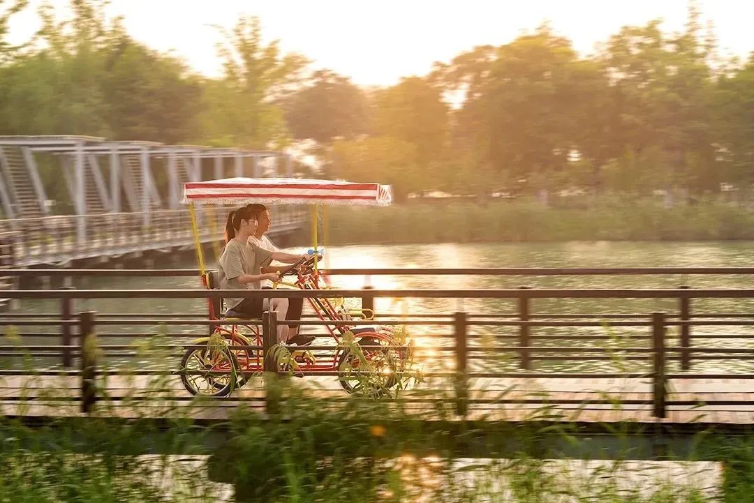还可搭乘接驳车,或全家人骑行前往夕露园。夕露园依湖而建,风景如画,有水乡农舍,水上栈道、迷你养蜂场...还可以玩皮划艇、独木舟、垂钓等水上活动。