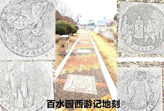 花间飞韵集东坡”不知出于何人之口、何人手书。唐朝白居易“君以旷怀宜静境,我因蹇步称闲官”、马戴“点点抱离念,旷怀成怨歌”、僧蛮“旷怀相对景何限,落日乱峰青倚天”等古人多有“旷怀”诗句佳作。其实诗句中流露出的貌似“豁达”实质“忧怨”,倘若登此小亭真能“旷怀”,定能游人如织(调侃)。此小园区正在开发中,有一些新栽树木,除此“旷怀亭”及沿河石刻外别无景点。将其归属“百水园景区”中是因为其沿河石刻内容是“西游记”,与百水园沿河石刻“西游记”才能完美成一体。“百水园景区”中“西游记”石刻是凤凰河景区中《地刻流芳》内容之一,也是“百水园”景区中一大景点。从百水园“不舍亭”南侧沿河道路上开始,每隔一段距离铺设一块60 X 60 CM正方形浮雕刻画,上面刻画配文字说明记叙着一个个西游记故事。凤凰河上“百水园景区”地刻是“西游记”、《历代先贤家风园》景区地刻是“三国演义”、《凤冠溢彩园景区》地刻是“水浒传”。三处地刻共有326块,每处各有多少块未见记载。《西游记》全书共100回,分为石猴出世·大闹天宫、取经缘由师徒来历、屡遭挫折·降妖伏魔、到达灵山取得真经四部分,由此推测“百水园”景区中“西游记”地刻是100块。