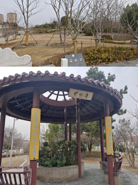 十里文化十里景”两句总结性楹联准确描绘出凤凰河景区的绿化美景。过东城河行人桥后到永泰路丹凤桥之间是一个独立小园区,北侧有一稍高土坡,坡上建有小亭名“旷怀亭”。“旷怀”指人襟怀豁达。亭上楹联“水岸流风臻上善