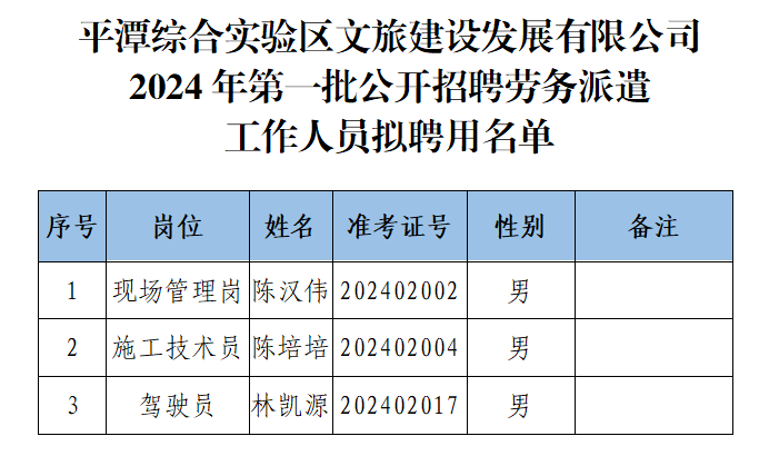 根据《平潭综合实验区文旅建设发展有限公司2024年第一批公开招聘劳务派遣工作人员公告》,在资格初审、面试、资格复审及体检基础上,拟聘用陈汉伟、陈培培、林凯源同志为平潭综合实验区文旅建设发展有限公司劳务派遣工作人员,现予以公示。
