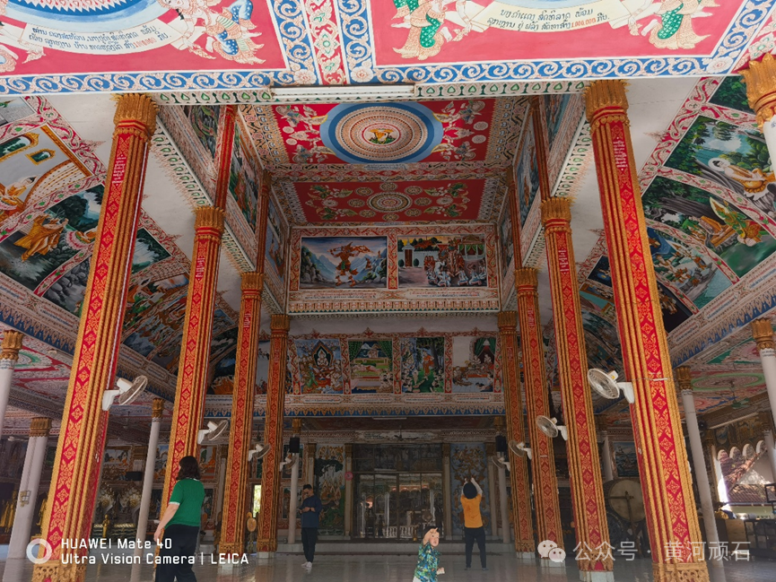 塔銮本为瓦塔銮寺的组成部分,但由于它的重要性远远超过此寺,所以人们通常只称塔銮,是老挝的佛教圣地,老挝的象征和国宝,是老挝寺塔中最为宏伟的一座,其主塔形象还出现在了国徽里。许多人不顾午后万象阳光的歹毒,在这里拜谒品味塔銮的辉煌。我参观了这座老挝一字号景观之后,意犹未尽,不顾导游劝阻,执意去了其旁边的瓦塔銮寺。在我看来,塔銮再具有诱惑力仍然只具有寺庙的外在象征意义,一座寺庙的灵魂应该在寺庙所发挥的内在精神价值,而不在于其塔的宏伟。当我“跑过”瓦塔銮寺,在诵经大厅匆匆一瞥,却被这个大厅四周墙壁上与穹顶上精彩的彩绘震撼了。大约三五百平方米的彩绘图,分数十个巨幅画,完整地讲述了释迦牟尼成佛的经典故事。如此绚丽多彩、生动形象的彩绘佛经传说或许只有在老挝这样的佛之国才能有吧!