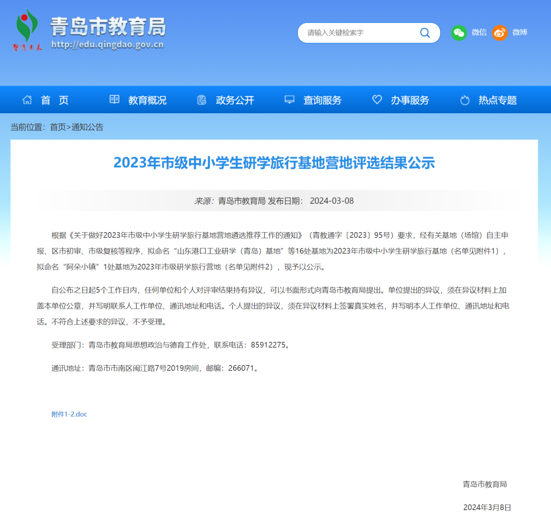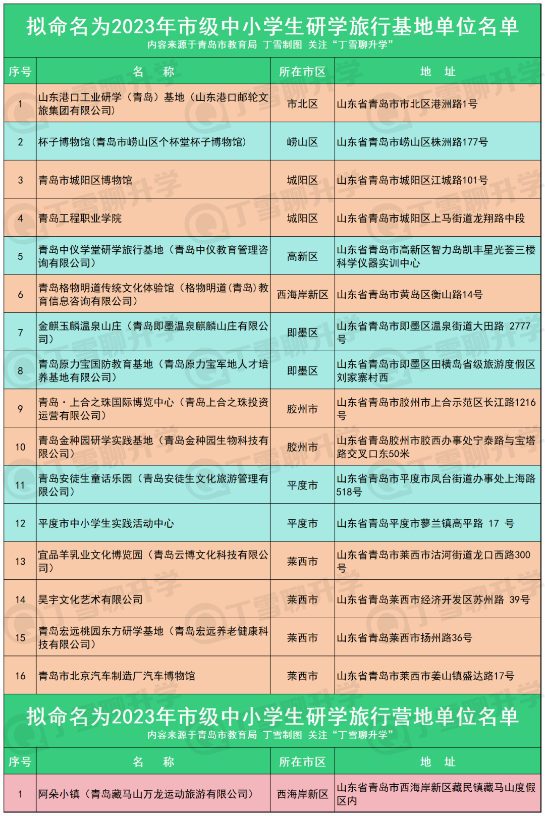 根据《关于做好2023年市级中小学生研学旅行基地营地遴选推荐工作的通知》(青教通字〔2023〕95号)要求,经有关基地(场馆)自主申报、区市初审、市级复核等程序,拟命名“山东港口工业研学(青岛)基地”等16处基地为2023年市级中小学生研学旅行基地,拟命名“阿朵小镇”1处基地为2023年市级研学旅行营地,现予以公示。