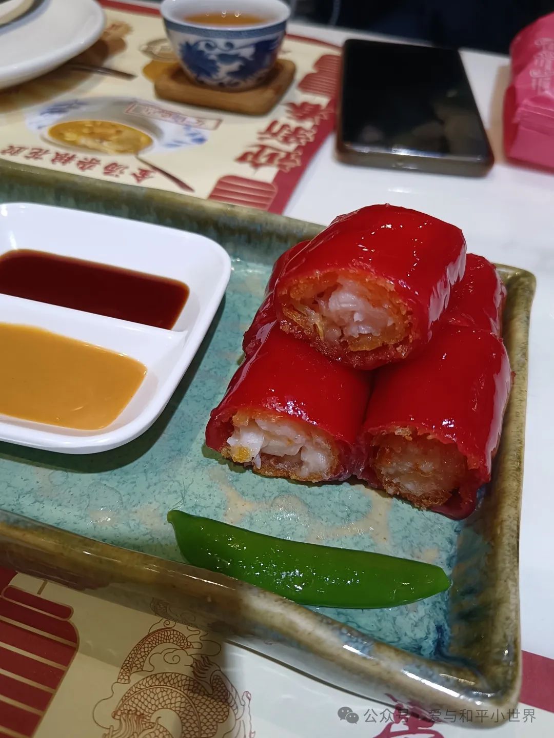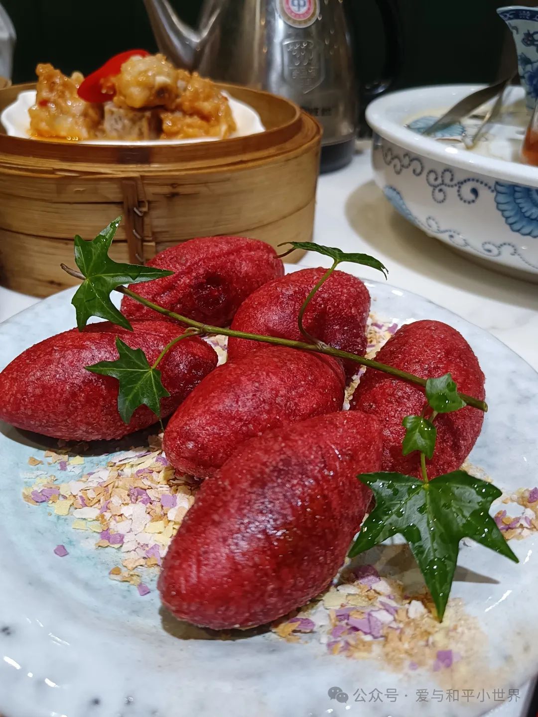 而我完全没了解过的红米咸水角也特地加了一份,口味很奇妙,甜甜的脆脆的糯糯的,然后有一点海鲜的味道。找了个男服务生问这里面有啥,他非常油腻的说里面有很多东西balabala,看来是不知道,找的托词。后来又问了个小姑娘,小姑娘就认真多了,然后去问了人,告诉我们有猪肉靡什么的。个人有点推荐,因为没吃过,很有趣。