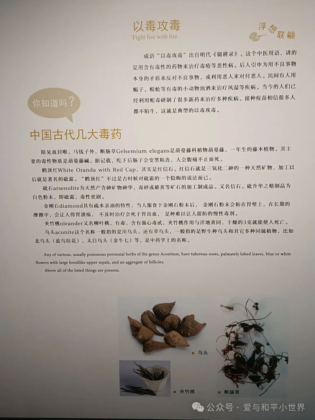 中草药馆里有很多科普,甚至细致到把很多草药的根茎叶放在介绍旁边,但确实我看下来,有毒的和没毒的,也分辨不出来。果然神农尝百草那不是一般人能干的。