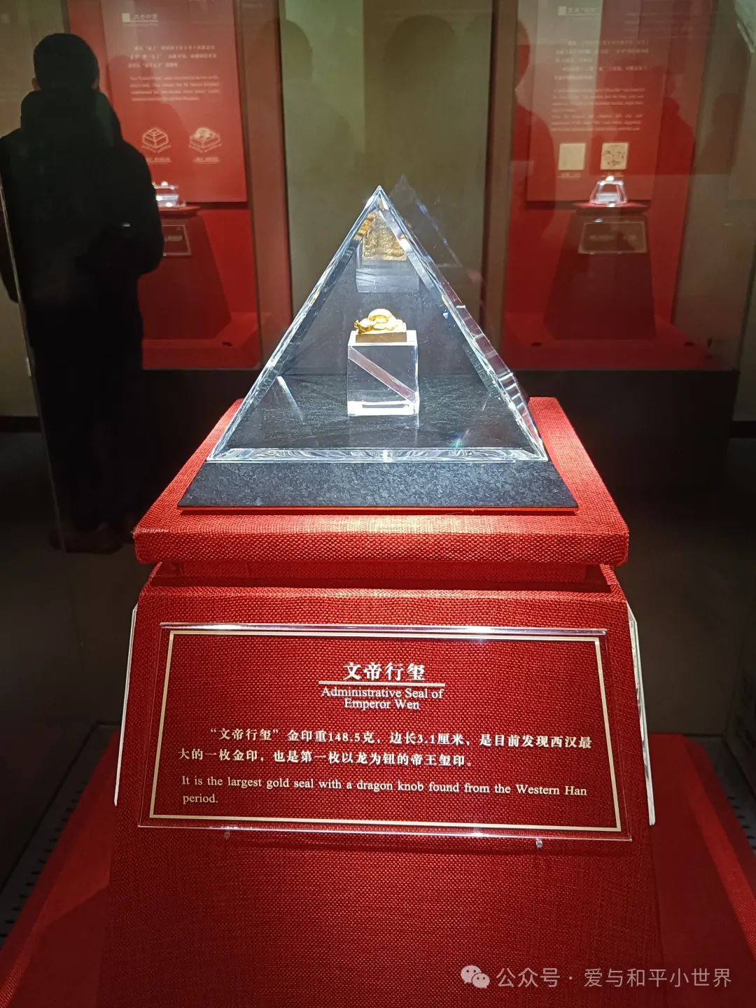 其中非常有特色的是一尊文帝行玺,纯金有148.5克。是目前发现西汉最大的一枚金印,也是第一枚以龙为钮的帝王玺印。反正我就看到这枚,其他都是乌龟印。所有牌牌写的就是乌龟,不是龙的六子霸下(又名赑屃bì xì),驼碑的那个。