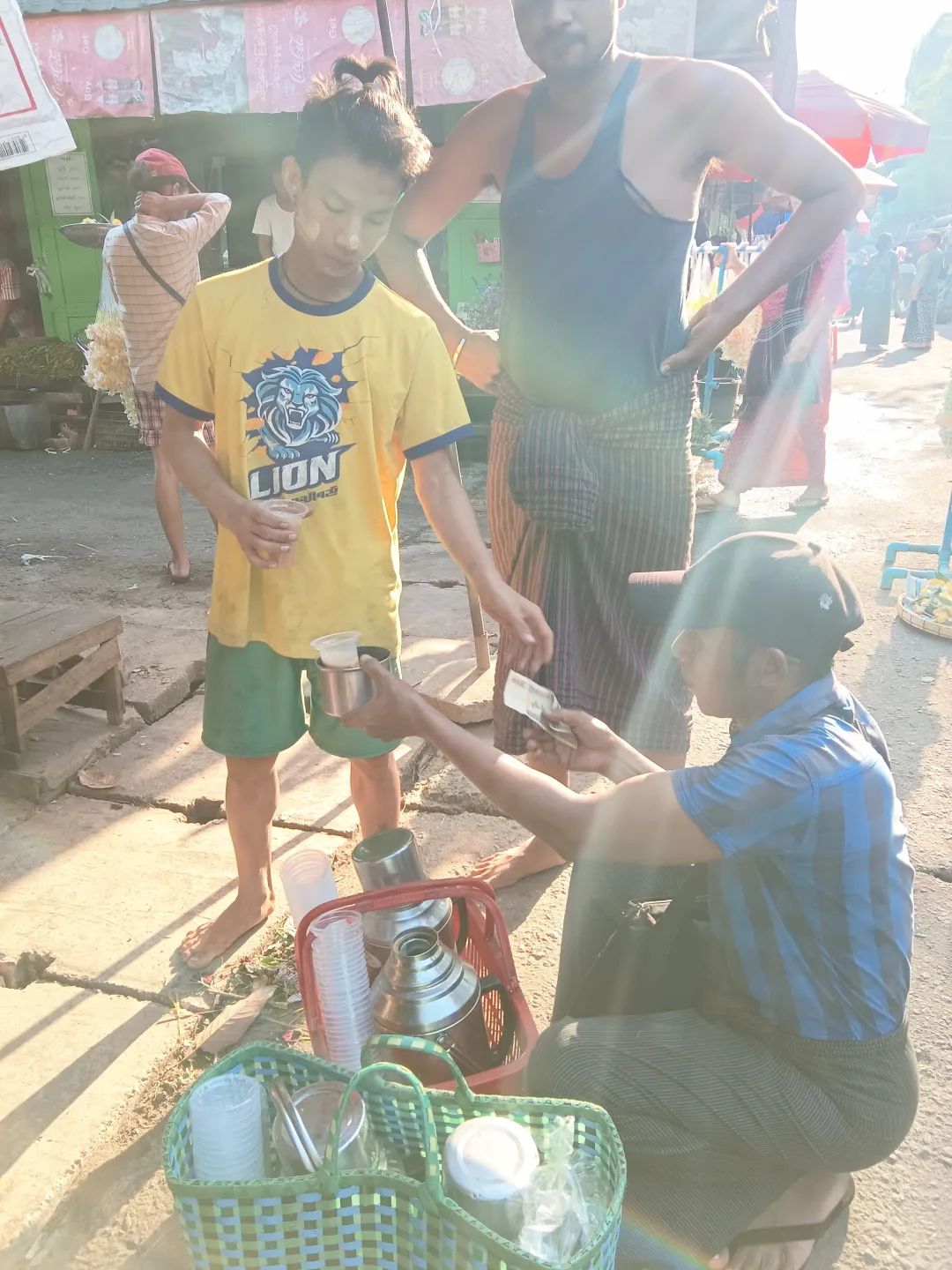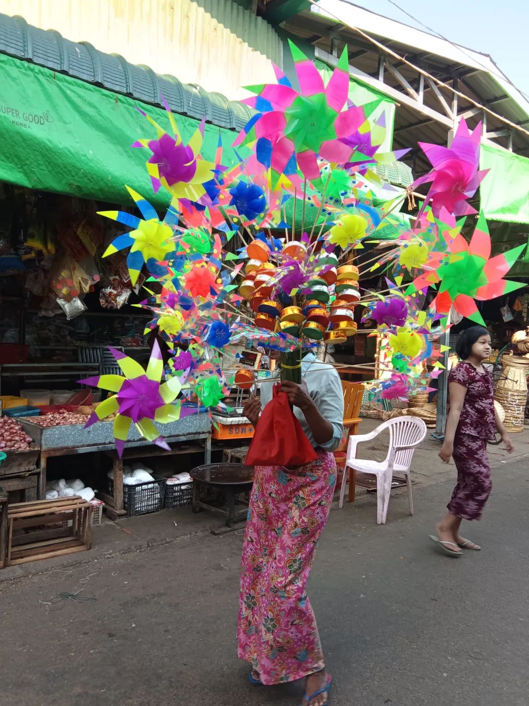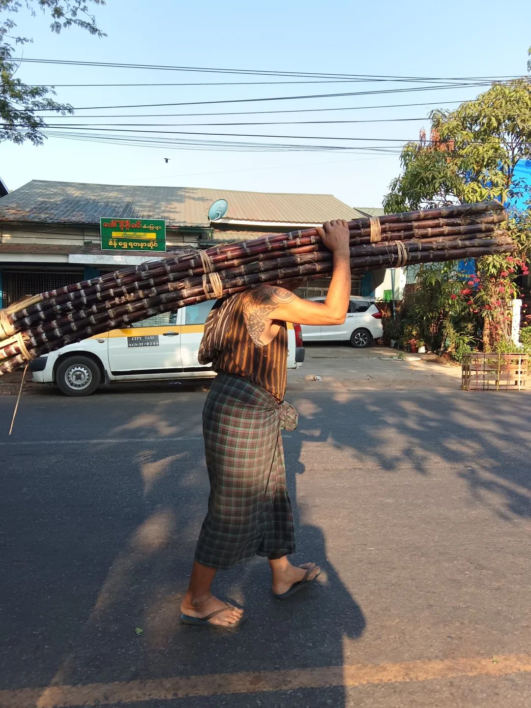 吃饱喝足,就去逛市场。五颜六色,人来人往,让我好兴奋。两个不急不慢,慢慢走,慢慢看。我则随机抓拍。当地人非常好,直接对着他们拍也不恼怒。刚准备进入市场,就看见一个大叔,膀子上纹着花纹,肩膀上扛着一大捆甘蔗。阳光此时恰好,我就跟着在他后面,不仅拍了照片,还录了视频。