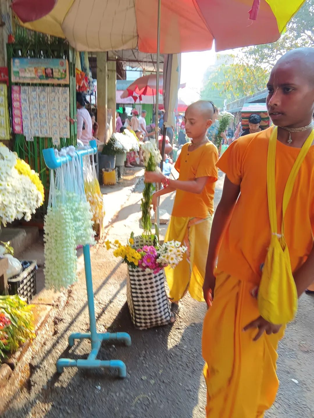 进口这里都是卖鲜花的,今天第一次看见印度庙的孩子过来挨个店铺讨鲜花,我也觉得非常有趣和好玩。并看见一种新的花上市,我把头探下去,还有蜜蜂在飞来飞去了。