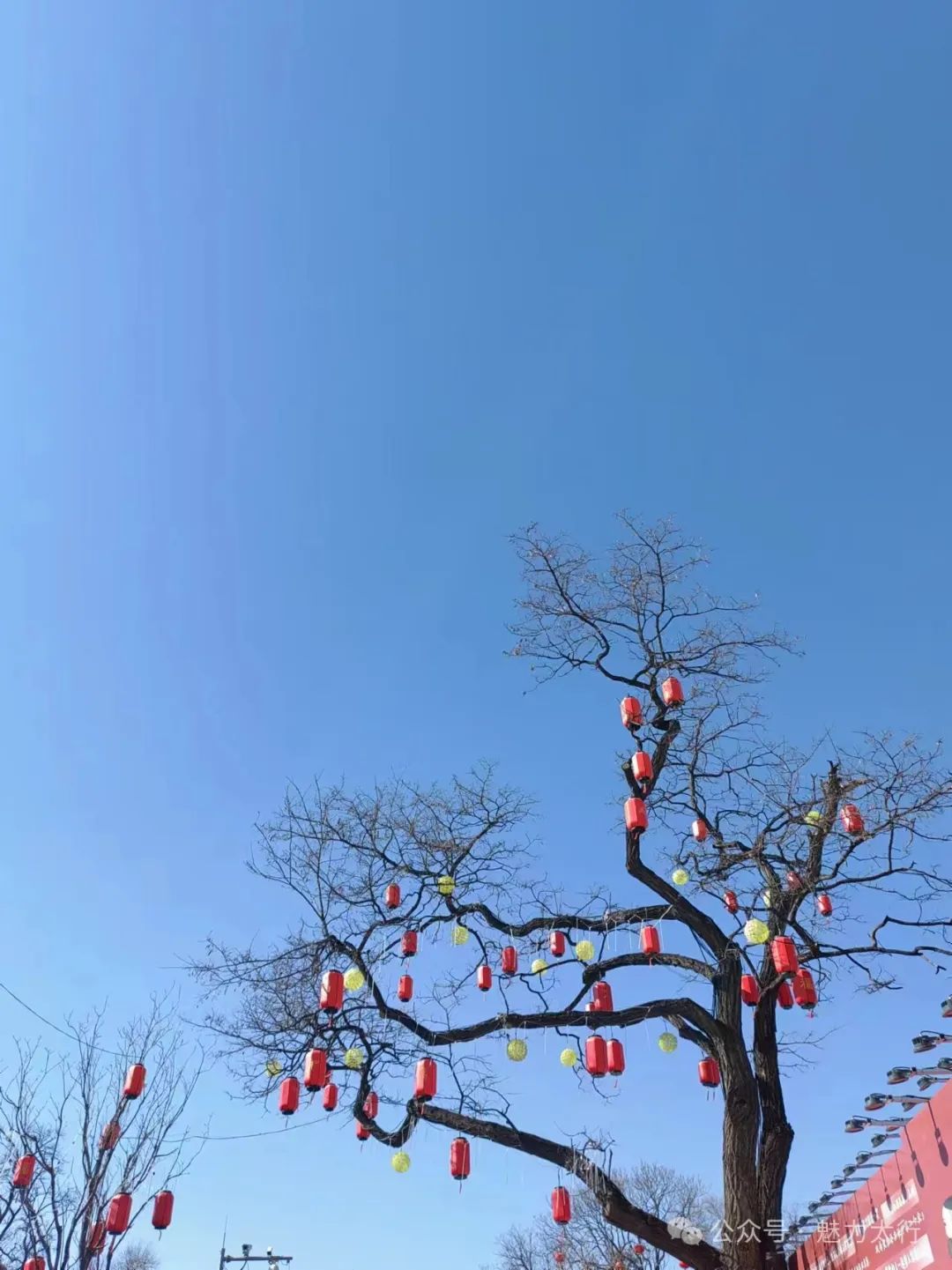 整条街上有很多高高的国槐树,树上的红灯笼在阳光的照射下格外亮丽。