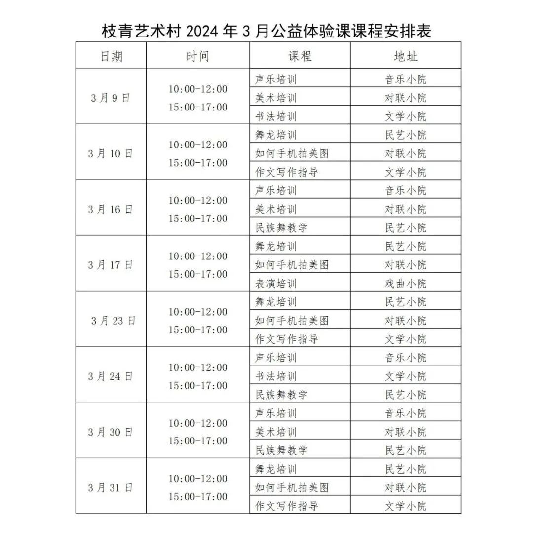 枝青艺术村还重磅推出周末公益体验课,免费!3月9日开课!