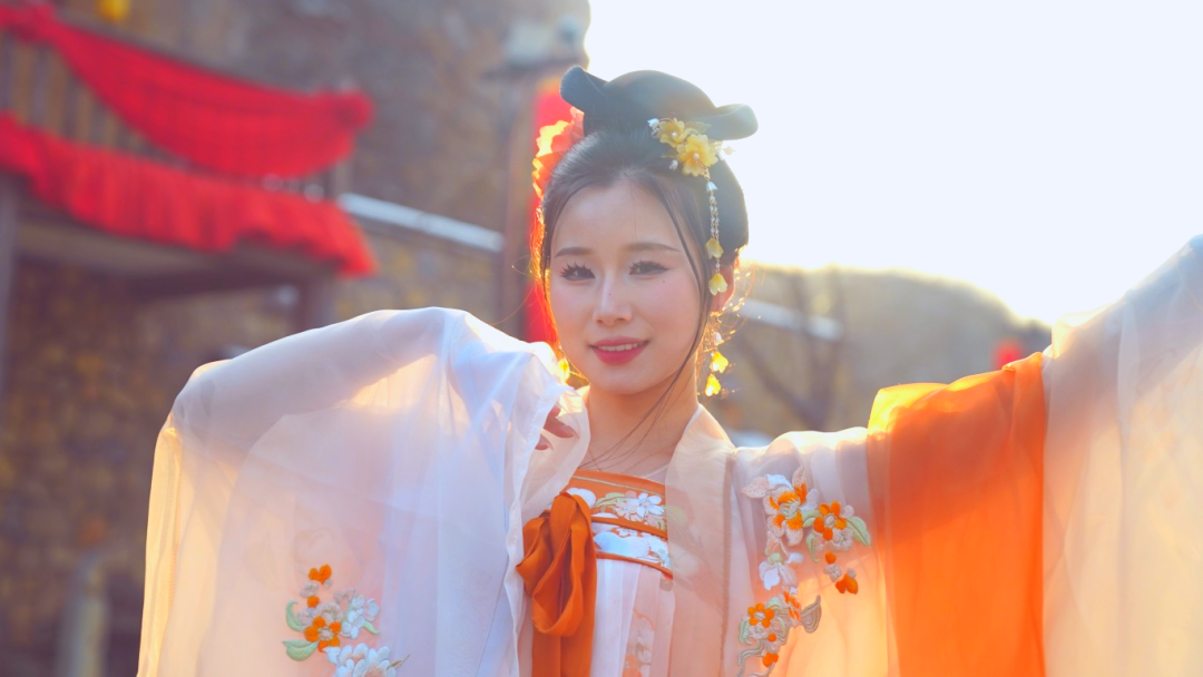 着一袭汉服与百花共舞
