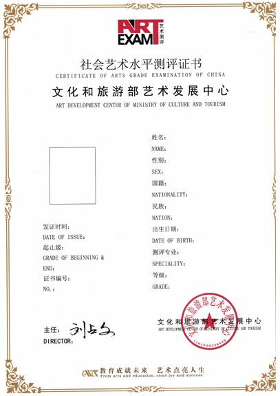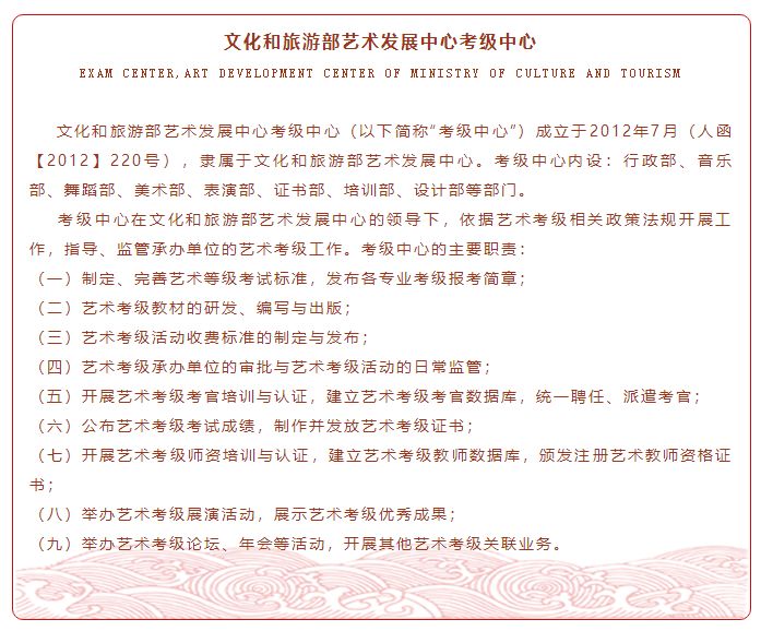 中华人民共和国文化部是“全国社会艺术水平考级”的审批、监督与管理单位,文化和旅游部艺术发展中心考级是国内唯一具有政府资质,专业、权威、规范的考级机构,是规格高、有权威性、公开透明并受社会广泛认可的考级单位!