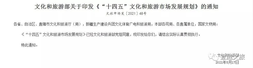 2021年5月17日,文化和旅游部发布《“十四五”文化和旅游市场发展规划》