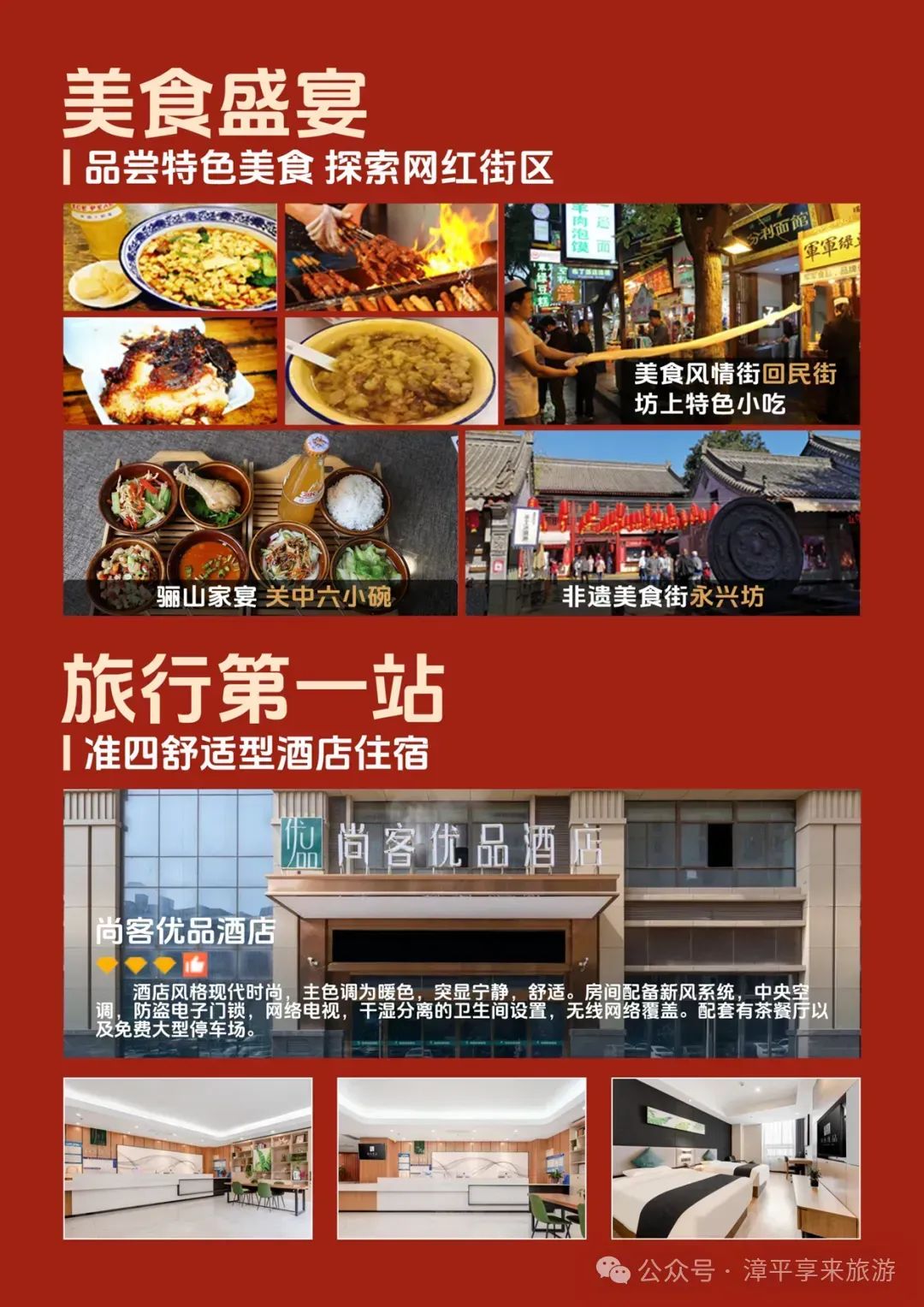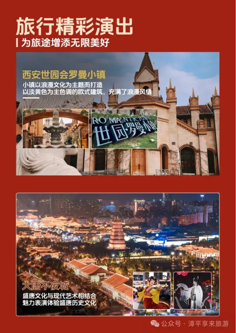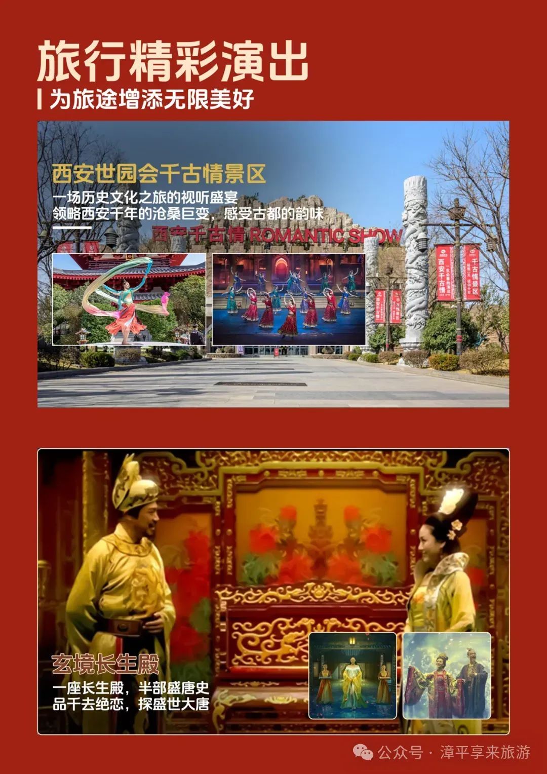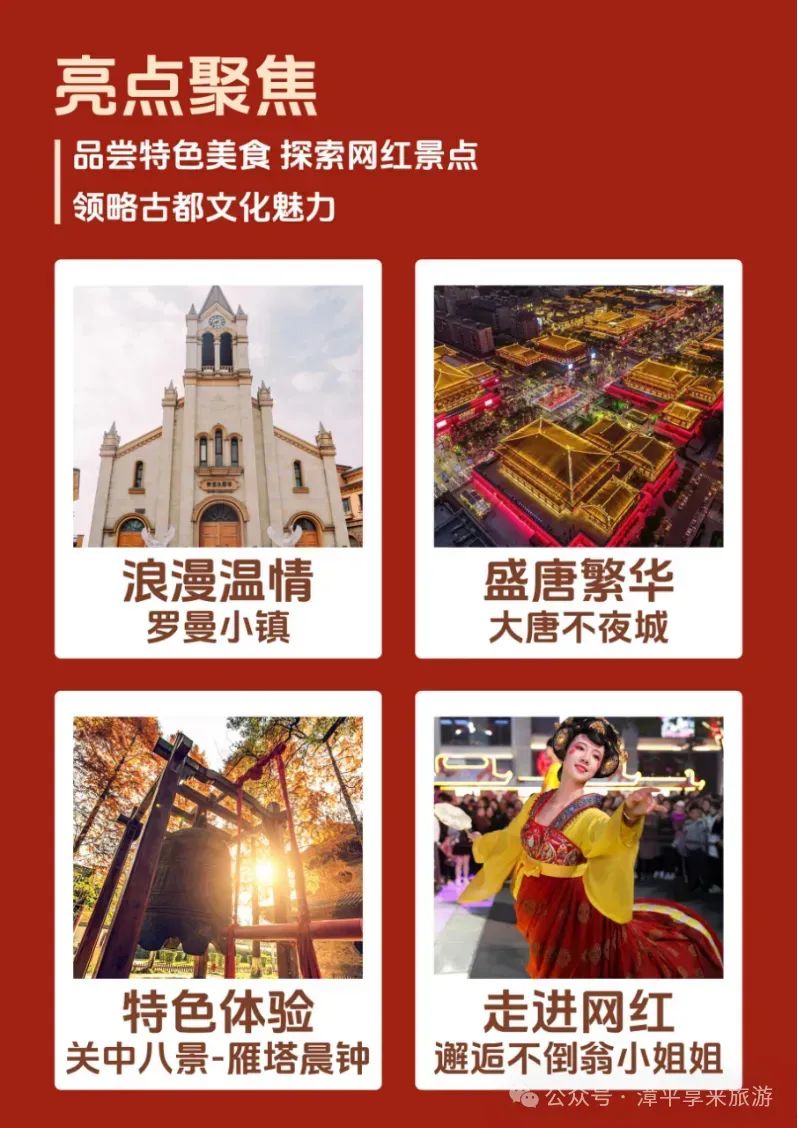 必消自费项目:白鹿原影视城套票160+网红导游娜娜花花讲解服务费160+无线讲解器耳机10+复制兵马俑38+换装体验38+千古情景区门票40=436/人,春季打包优惠399/人『亮点聚焦』:身临体验【白鹿原影视城】关中民俗文化,感受黄土地的沧桑往事、幽幽风情;『千年古刹』:荐福寺·小雁塔“雁塔晨钟”被列为“关中八景”之一。『品质住宿』:特别安排西安当地”预备准四星级别“舒适型酒店住宿『二大文博』:世界八大奇迹博物馆《兵马俑博物馆》,东方甄选董宇辉老师力推博物馆《西安博物院》『祈福长安』:玄奘归来-大慈恩寺雁塔祈福,祈愿一生幸福。『美食文化』:美食的天堂洒金桥街区夜市,西安本地人最爱的美食街。『特色餐饮』:骊山家宴品历史-秦宴六蒸碗或唐长安特色宴-金鸡报晓宴。第一天 漳平出发—西安