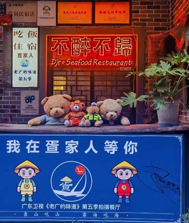 疍家人民宿的“不醉不归、我在疍家人等你”.