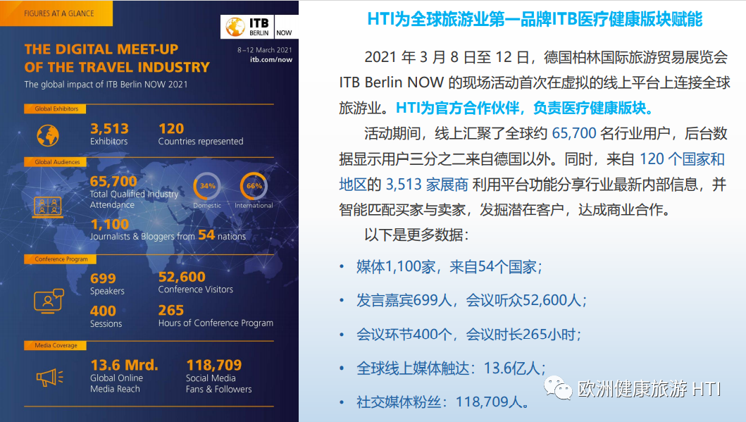 2021年3月,HTI赋能德国ITB Berlin柏林国际旅游交易会全球线上展会,协办国际医疗健康板块,共同吸引超3500名展商,盛况空前,在后疫情时代取得了超出预期的丰硕成果。