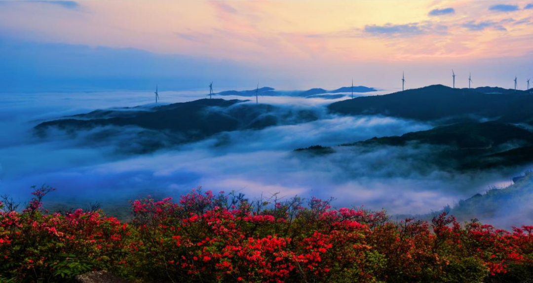 俯瞰那延绵十里的杜鹃花坡,绚丽的花海如诗如画,一直延伸至天际。而那翻腾变幻的云海,则宛如一幅浩渺无垠的白色绸幕,与花坡相互映衬,相得益彰。