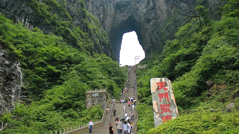【天门洞开】是罕见的高海拔穿山溶洞,上天梯登临天门洞共有999级台阶,象征着至高无上和天长地久,已成为八方来客朝圣天门的登天祈福之路。 |