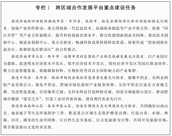 ▶支持济南新旧动能转换起步区—齐河县、禹城市、临邑县,济南市章丘区—邹平市—淄博市周村区,平阴县—东阿县—肥城市,济南南部山区—泰安市泰山区、岱岳区等探索跨市域毗邻县(市、区)一体化发展路径。