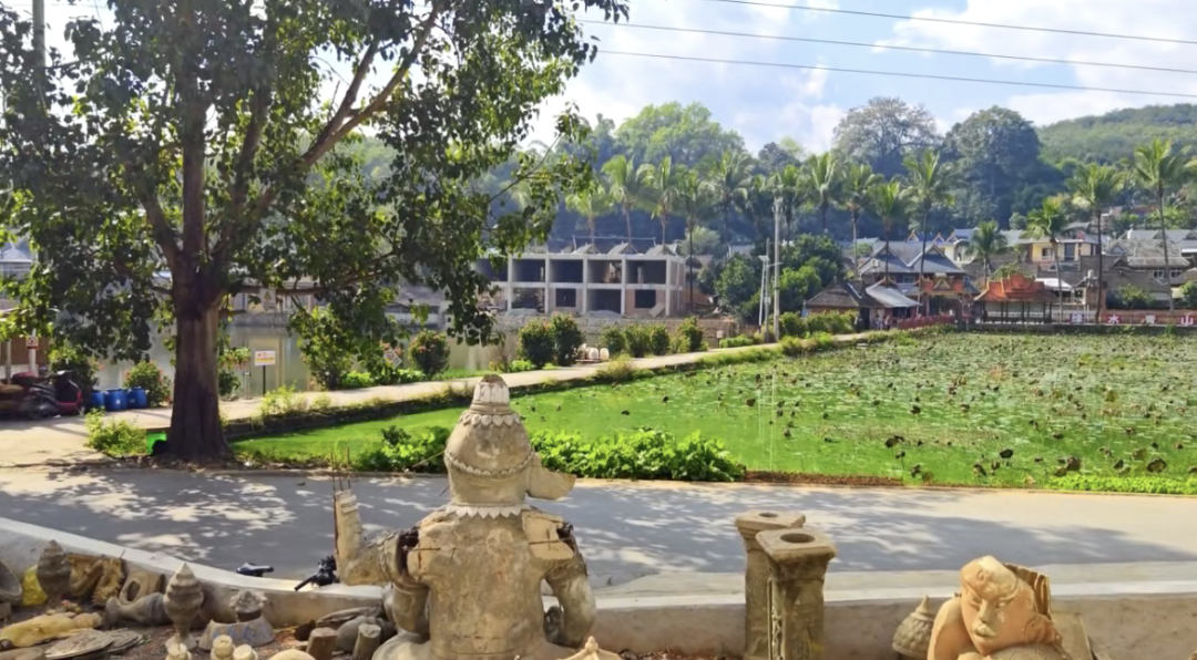 他花50块钱从村里一位大爷那收购了一头“象”,“镇院之宝”般摆在院落里,跟其他捡来的各色“古董”拼装在一起,形成了一片颇具傣家特色的花园造景,远远的,隔着一片池塘就能看见,算得上是青年养老院的“地标建筑”了。