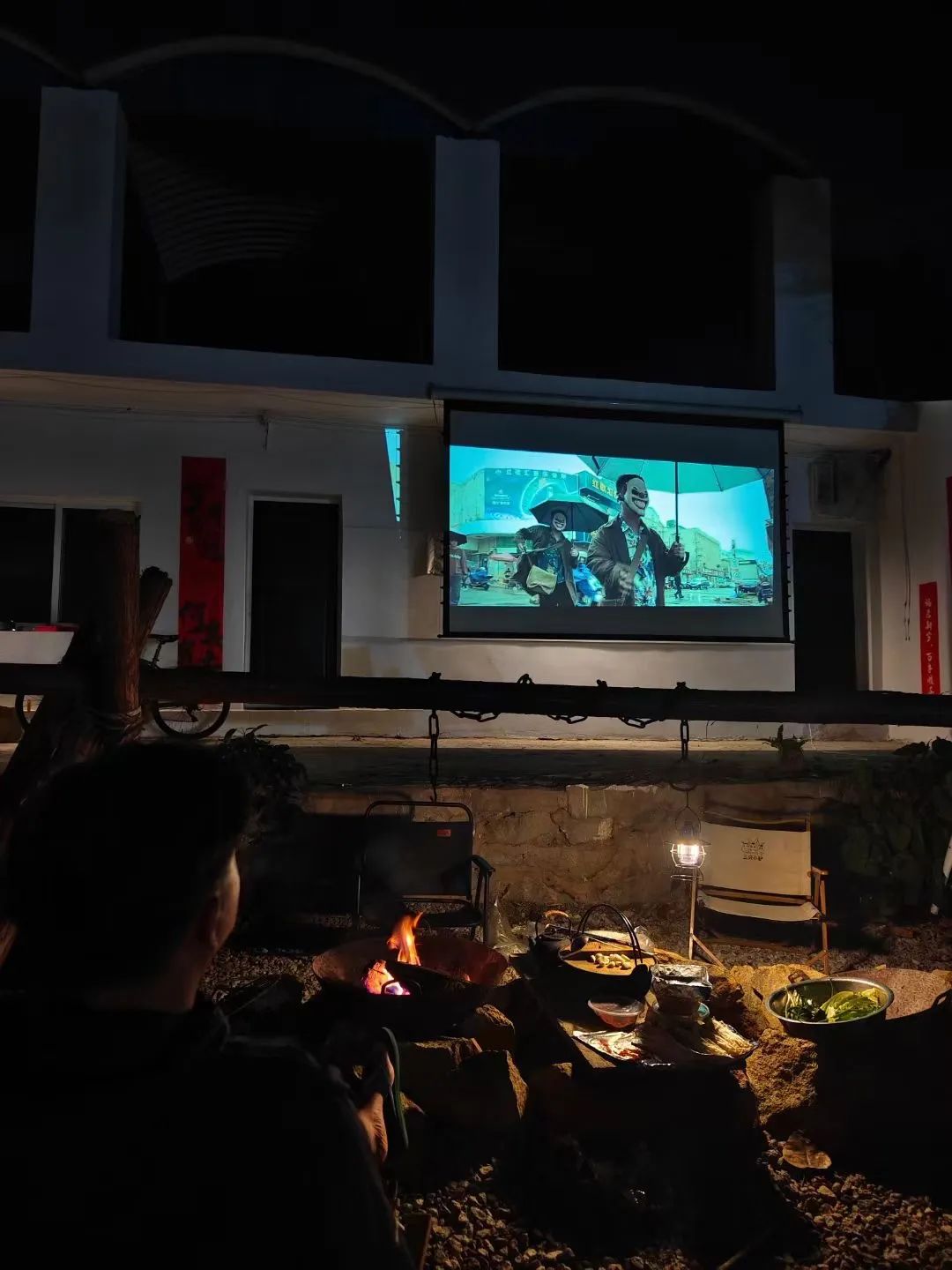 于是,我们经常能看到他骑着黄色小电驴行驶在村间小路上;冬天夜晚的篝火是不可或缺的角色,他有时一个人弹吉他,有时和朋友们一起煮茶、烤甘蔗;前段时间户外幕布安装完毕,晚间又多了一项“看电影”的娱乐活动。