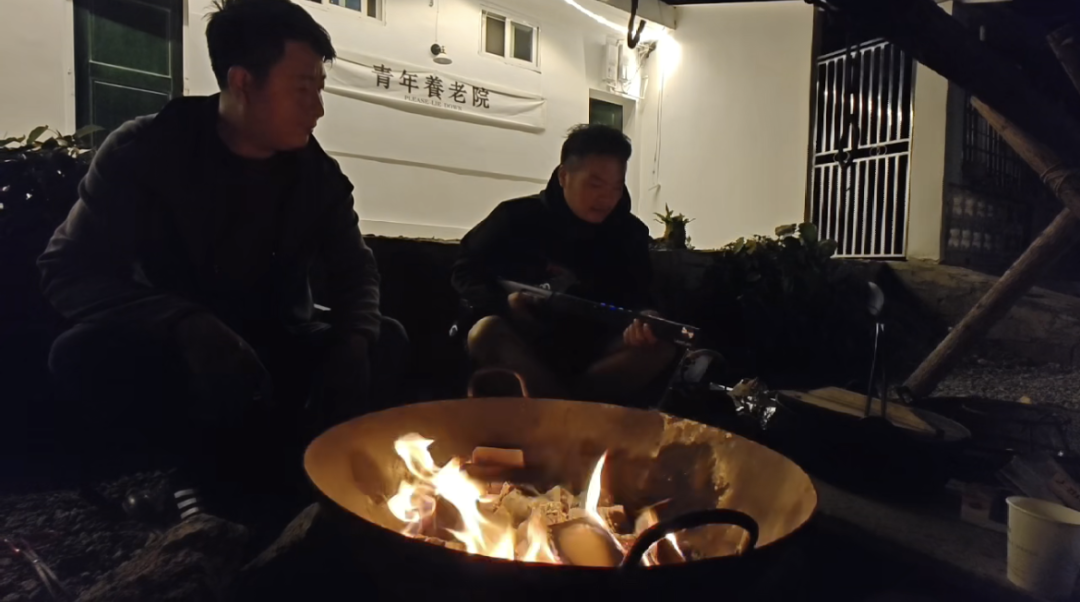 夜幕垂落,房屋院落前,一名年轻人正抱着吉他,一边烤火一边唱歌。