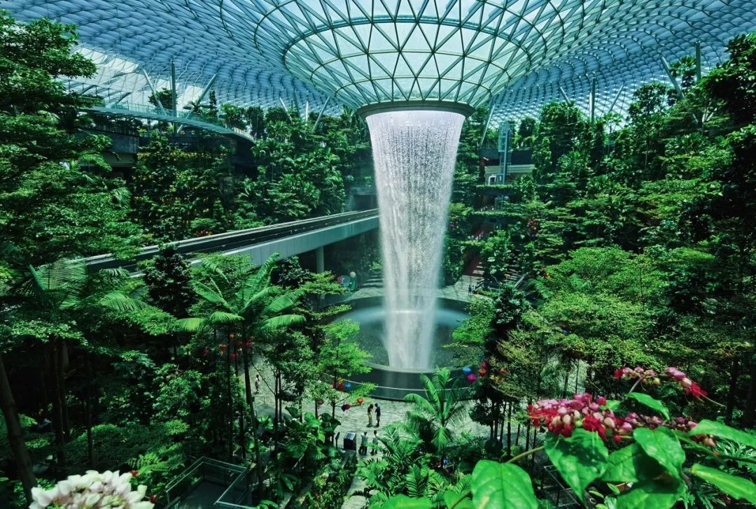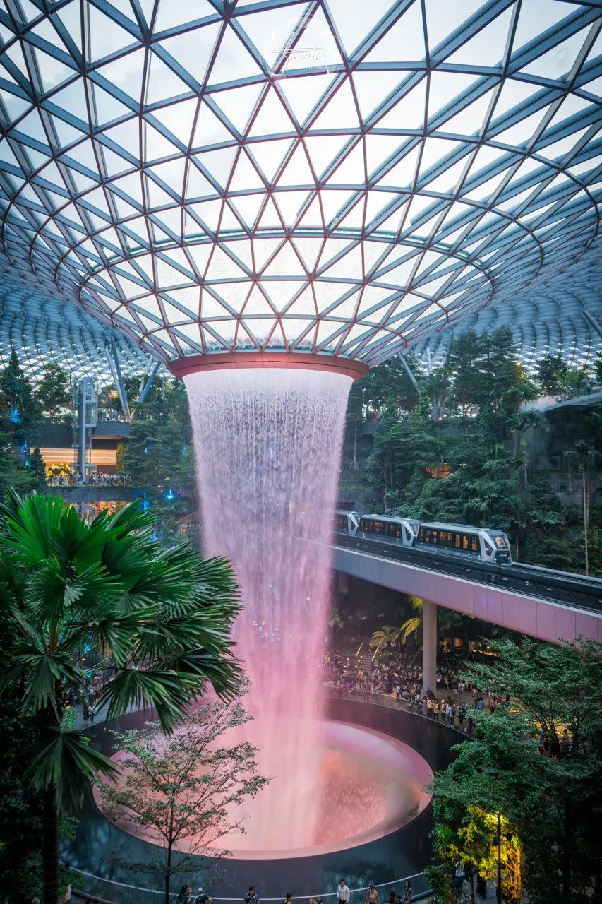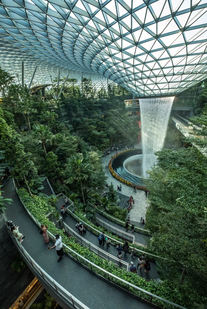沿着小径直到星空花园,到达星耀樟宜的顶端,位于中心位置的“雨漩涡”室内瀑布是世界上最高的室内瀑布,高达40米,站在天悬桥观赏瀑布,甚至能感受到水汽洒在脸上。
