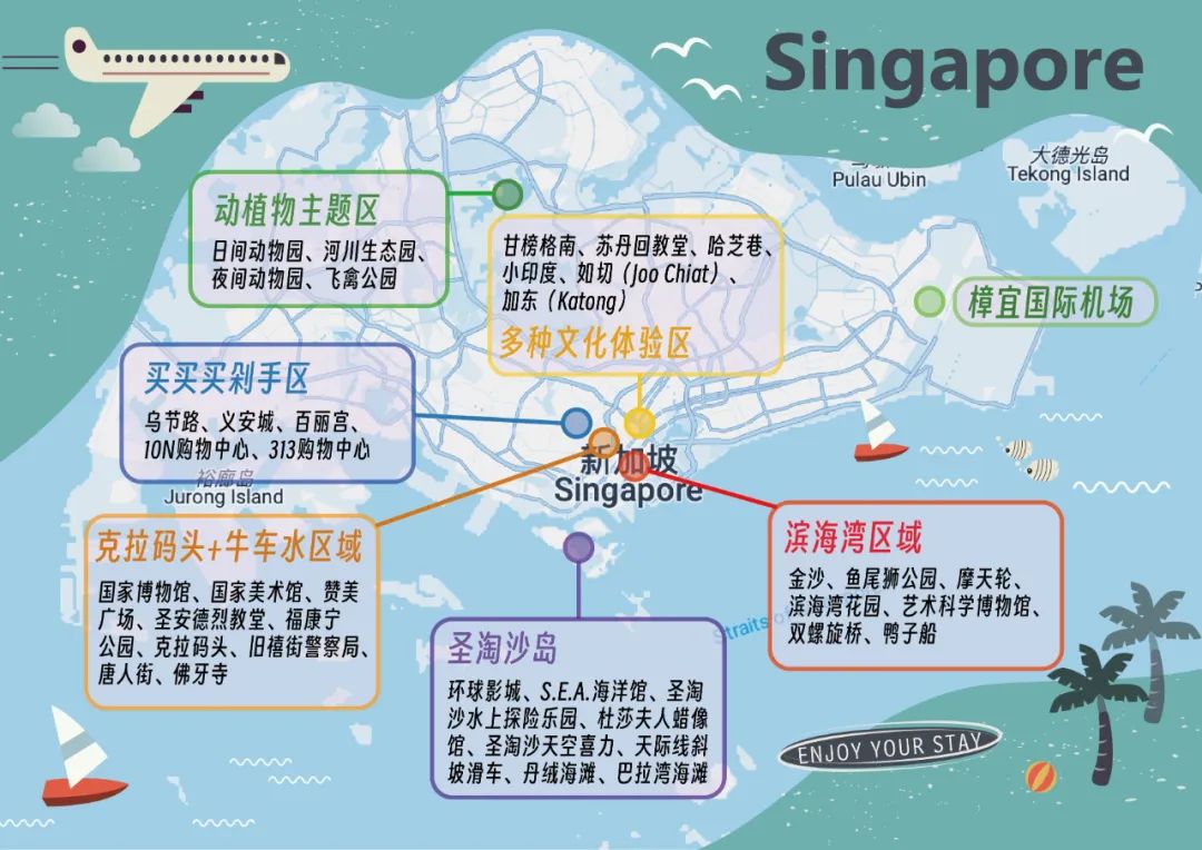 分别是:滨海湾区域、牛车水区域、多种文化体验区(感受马来、印度、娘惹文化)、圣淘沙岛、动植物主题区,以及买买买剁手区(乌节路)。