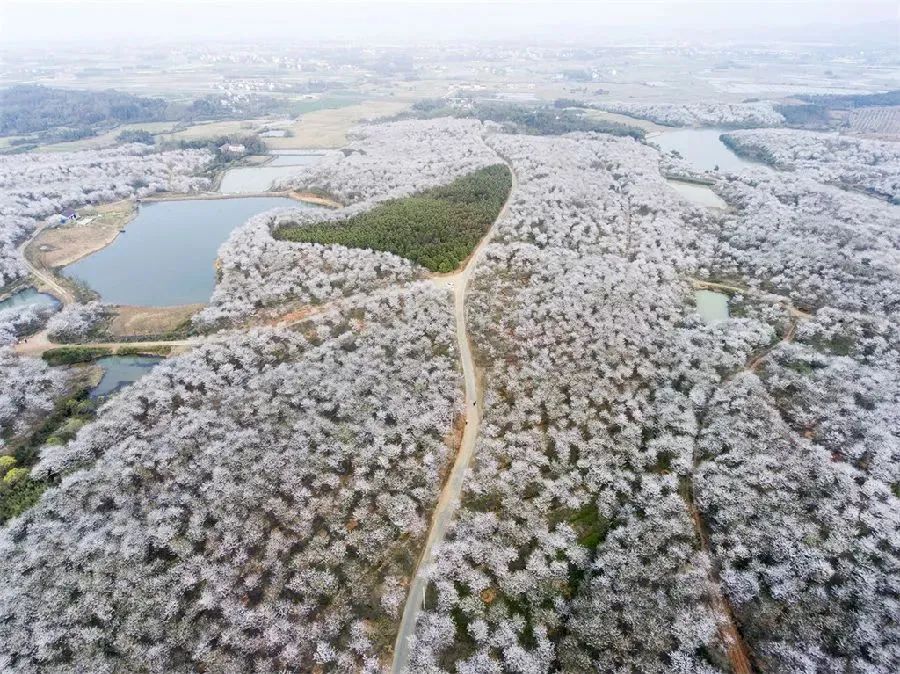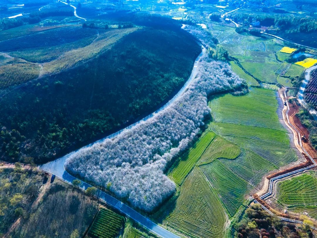 在樱花林的周边,有大片翠绿的茶园,茶叶吐露新芽,与粉樱相互映衬,一幅春日盛景就呈现在眼前。微风吹拂时,漫天的樱花雨纷纷扬扬地落下,让你感受到一场春日飞“雪”,令你不忍离去。