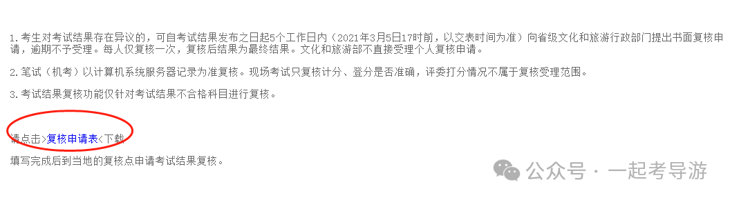 1.考生对考试结果存在异议的,可自考试结果发布之日起5个工作日内向省级文化和旅游行政部门提出书面复核申请,逾期不予受理。每人仅复核一次,复核后结果为最终结果。文化和旅游部不直接受理个人复核申请。