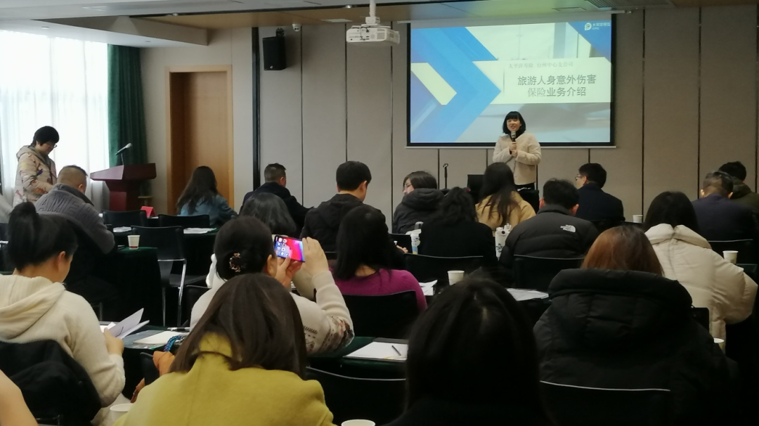 旅行社负责人、具体操作人员共计100多人参加。协会邀请了中国太平洋人寿保险股份有限公司台州中心支公司、江泰保险经纪股份有限公司浙江分公司、泰平国际保险经纪(上海)有限公司3家保险公司主要负责人和业内专家,共同为参会人员带来了全面而深入的保险知识培训。市旅游协会副秘书长曾华杰主持培训会议。