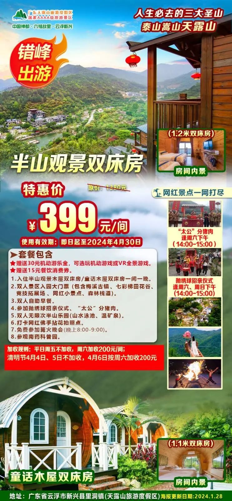 踏春出游,泡半山温矿泉~¥399元住天露山半山观景/童话木屋双床房,感受会呼吸的酒店!