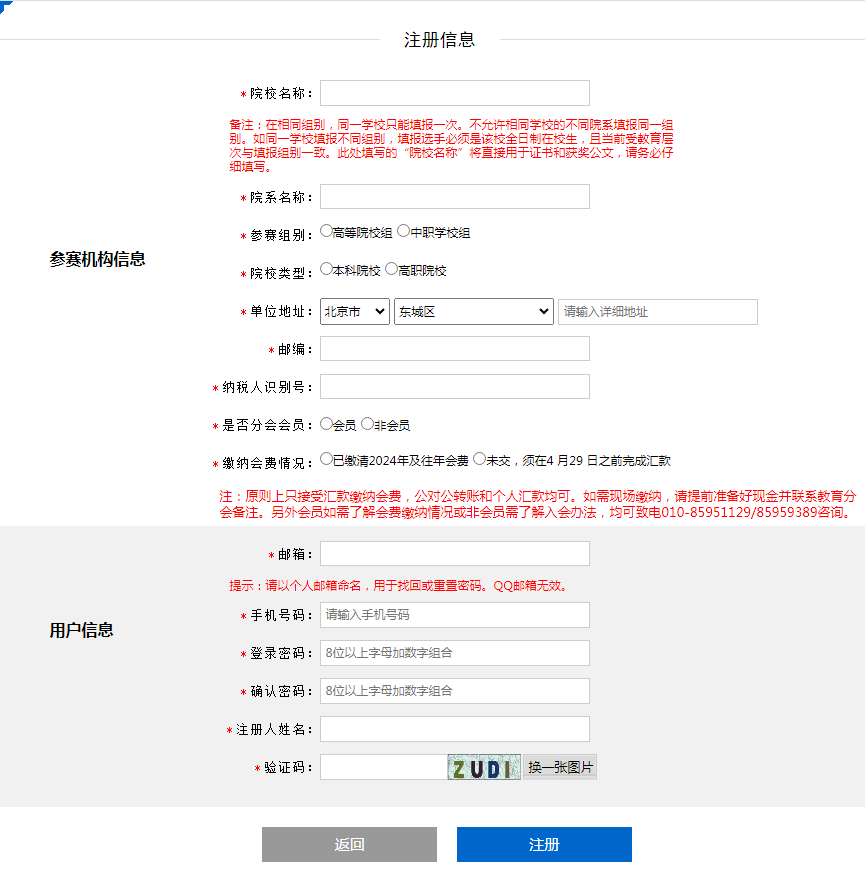 2、填写注册信息,*号为必填项。在相同组别,同一学校只能填报一次。不允许相同学校的不同院系填报同一组别。如同一学校填报不同组别,填报选手必须是该校全日制在校生,且当前受教育层次与填报组别一致。此处填写的“院校名称”将直接用于证书和获奖公文,请务必仔细填写。